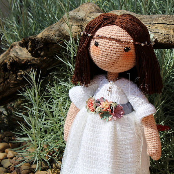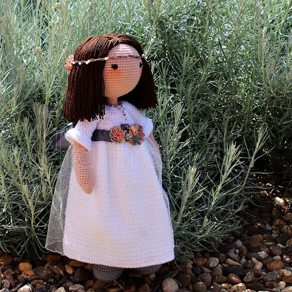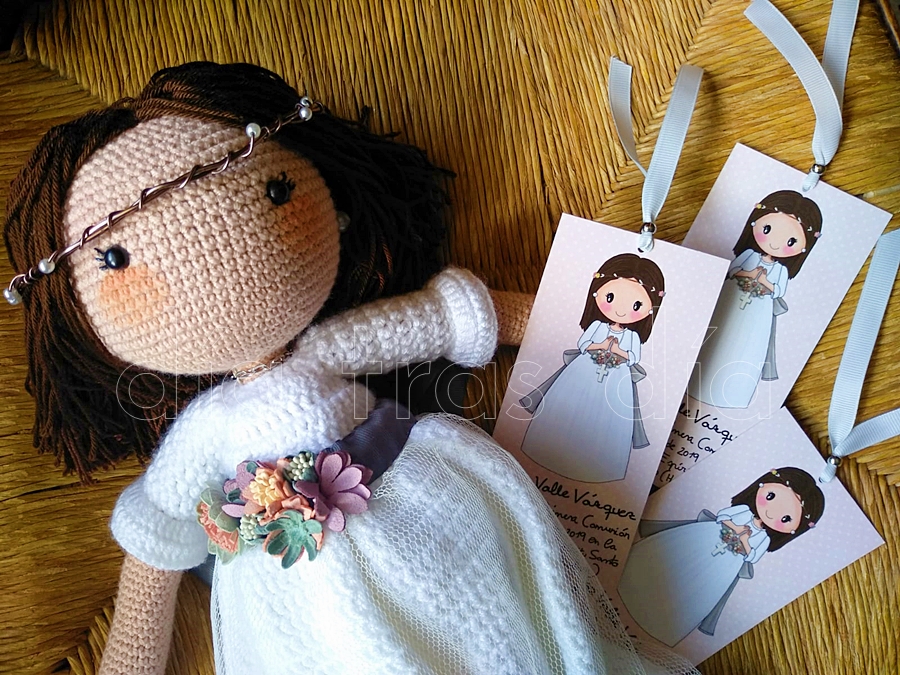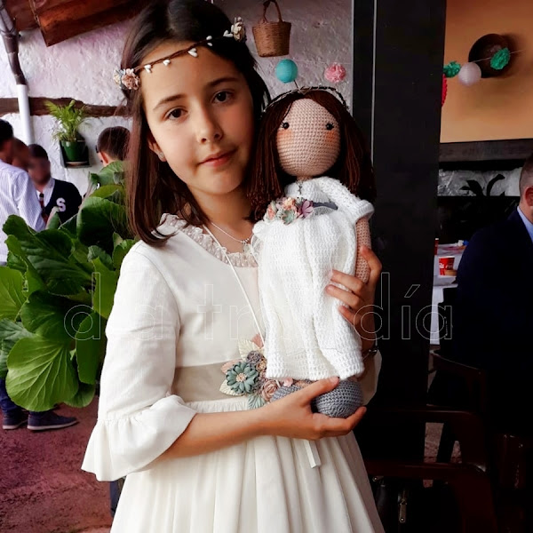 Como ya tenía las fotos de Paula vestida de Primera Comunión que Elena me había pasado para hacer el dibujo personalizado de los recordatorios y libro de firmas, no tuve más que volver a fijarme en todos esos pequeños detalles para que la muñeca amigurumi se transformase en una pequeña Paula.