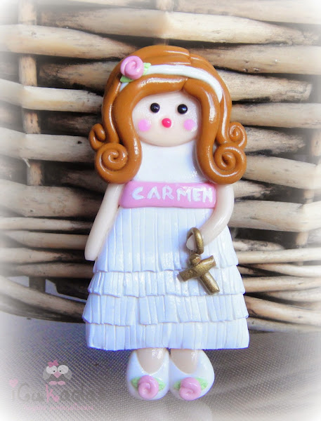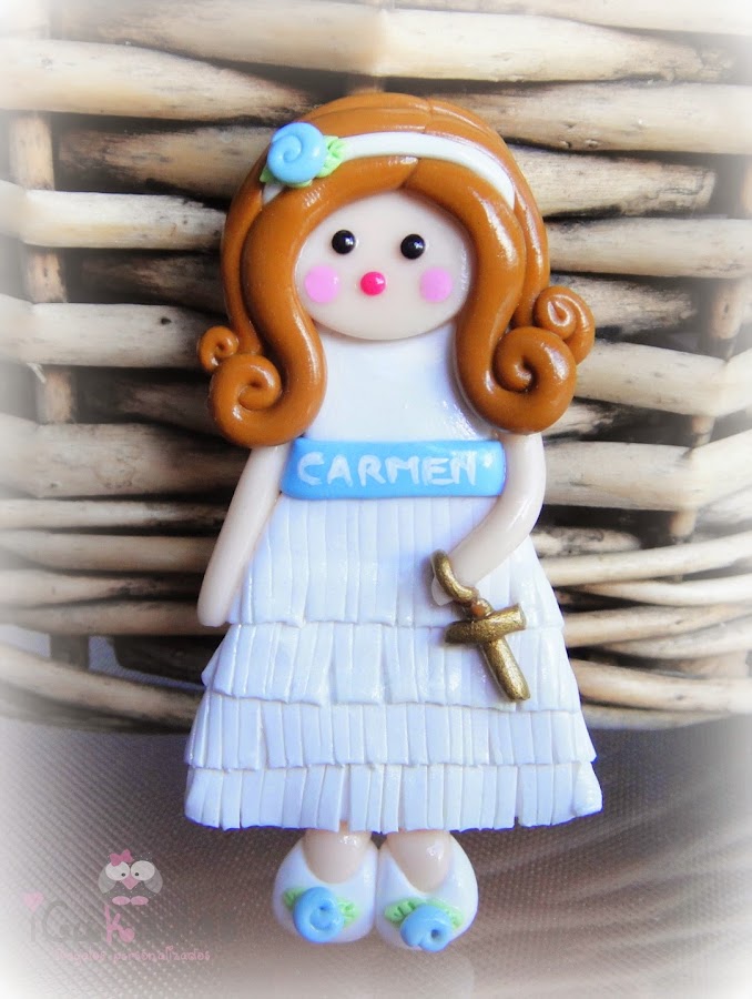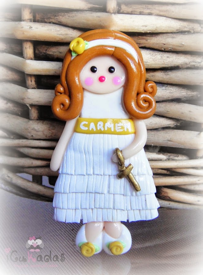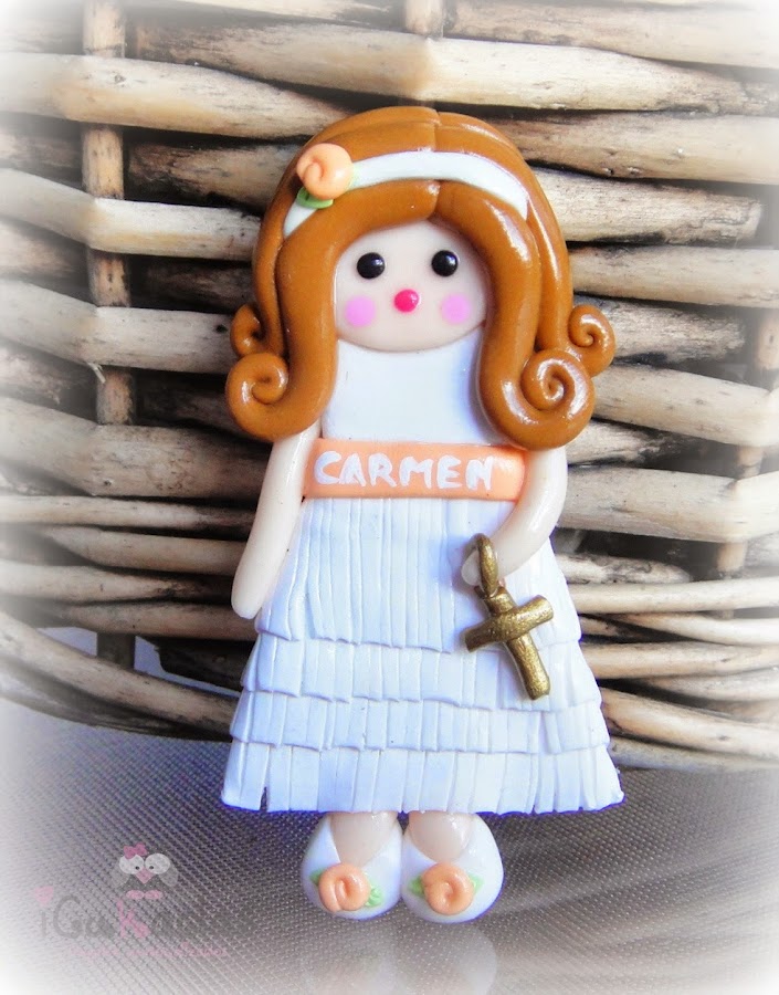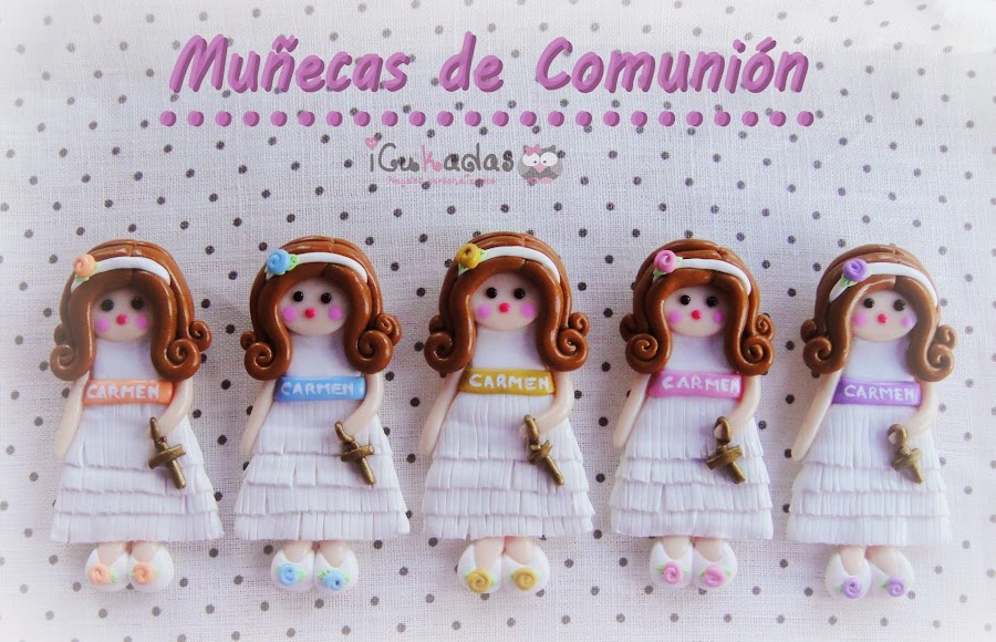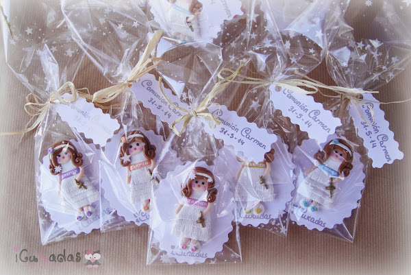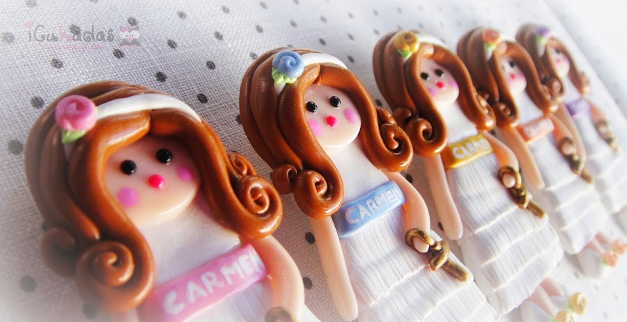 Pues si, muñecas de comunión, de fimo, como regalo para las invitadas, y además personalizadas.