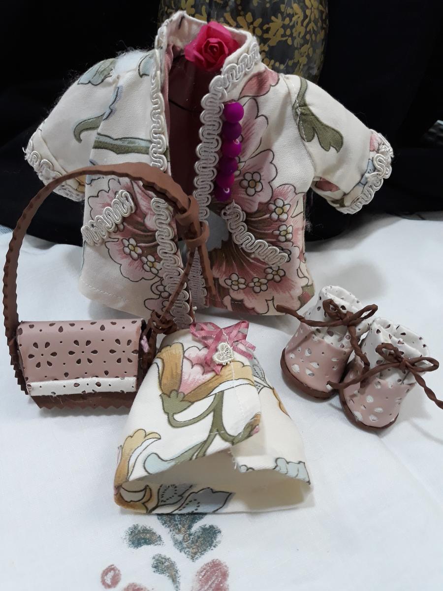 Conjunto de falda, abrigo, bolso y botas para la muñeca de trapo Ana