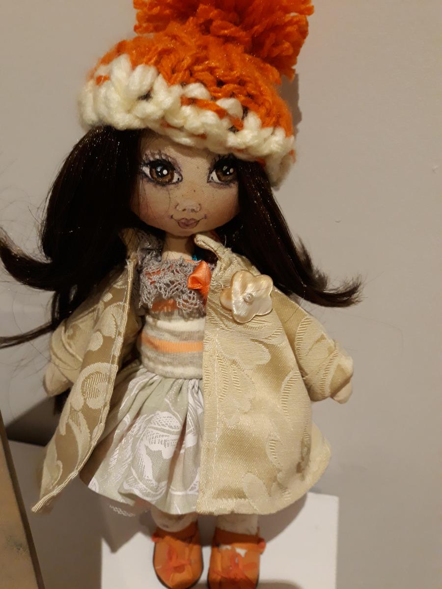 Muñeca de trapo de Celia, lleva falda con cancan de tul, calcetines a juego con las braguitas, gersey con remate de puntilla de bolillo en gris y un lazo naranja, color preferido de Celia, u gorro de lana