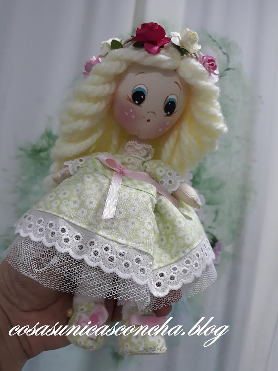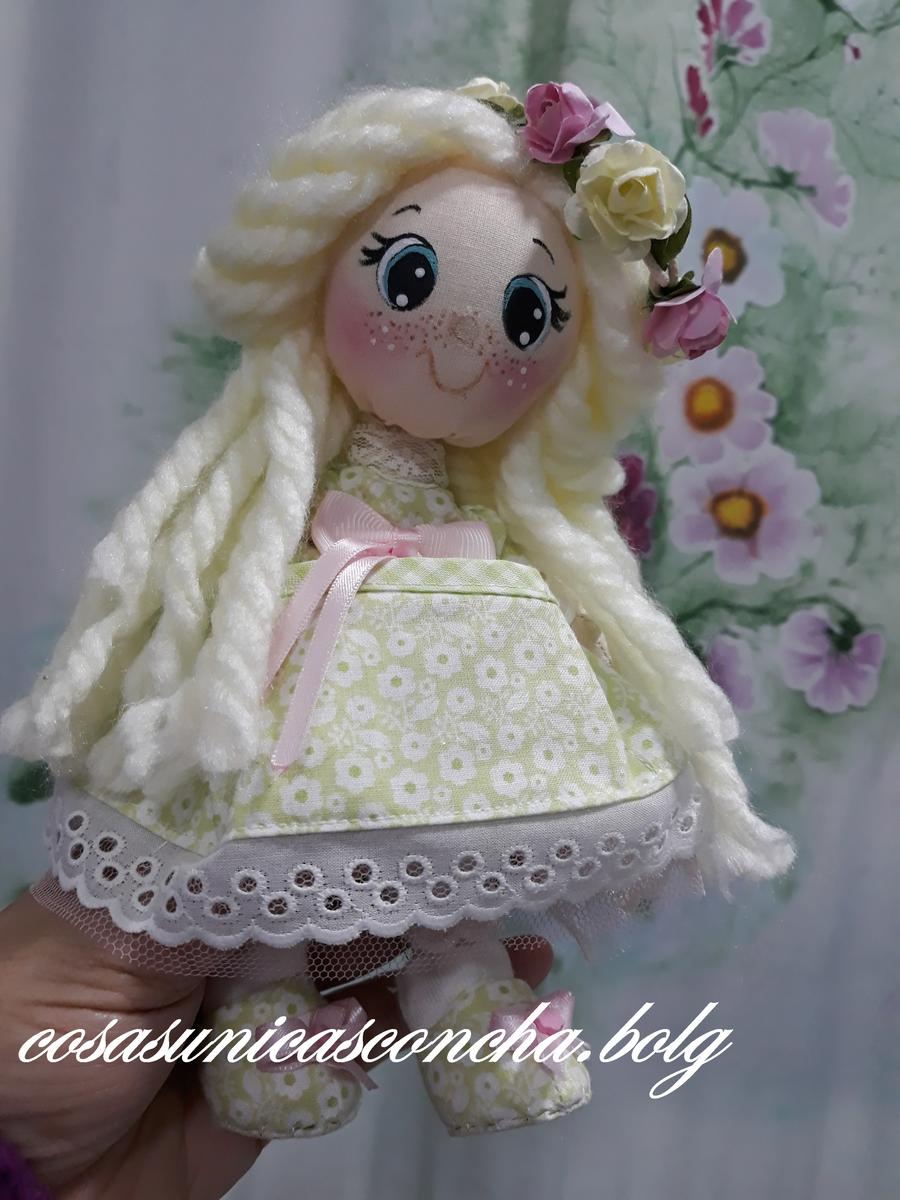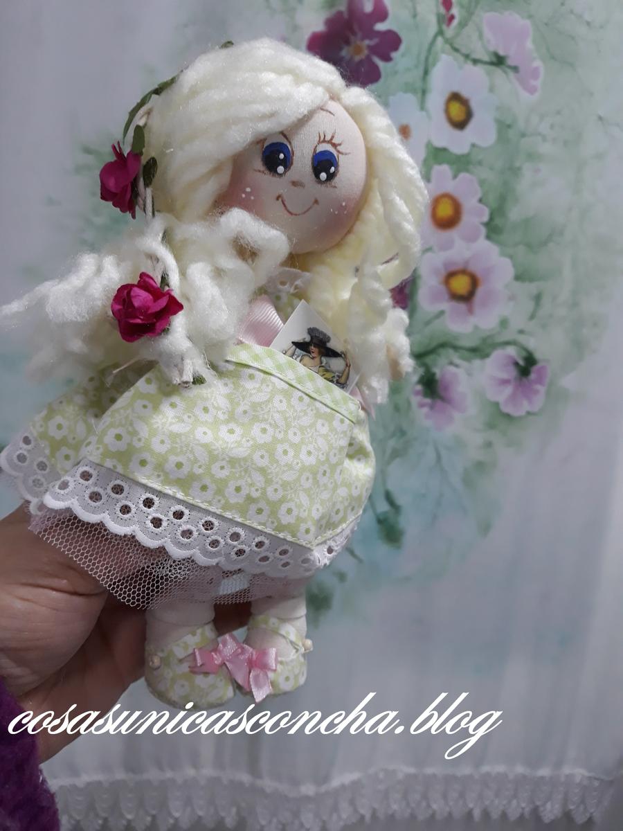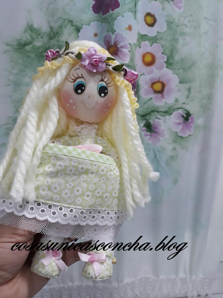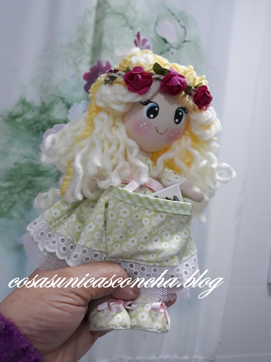 En esta entrada os dejo unas muñequitas de trapo pequeñitas, realizadas completamente a mano y con todos los detalles, el vestido es de batista rematado con una puntilla de cinta bordada y con un “” gran “” bolsillo, en los pololos también llevan puntilla en las patas y un lacito en la parte delantera al igual que los zapatos, el pelo es de lana y adornado con una corona de flores, la carita está pintada y todas diferentes y la muñeca se puede colgar y utilizarla como adorno o para poner las llaves o carmines, pinzas de depilar o limas de uñas, en fin hay que usar la imaginación porque en cualquier sitio quedaran preciosas.