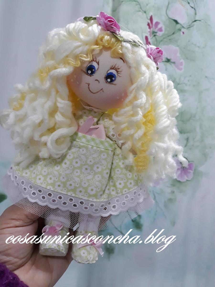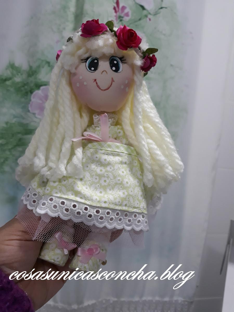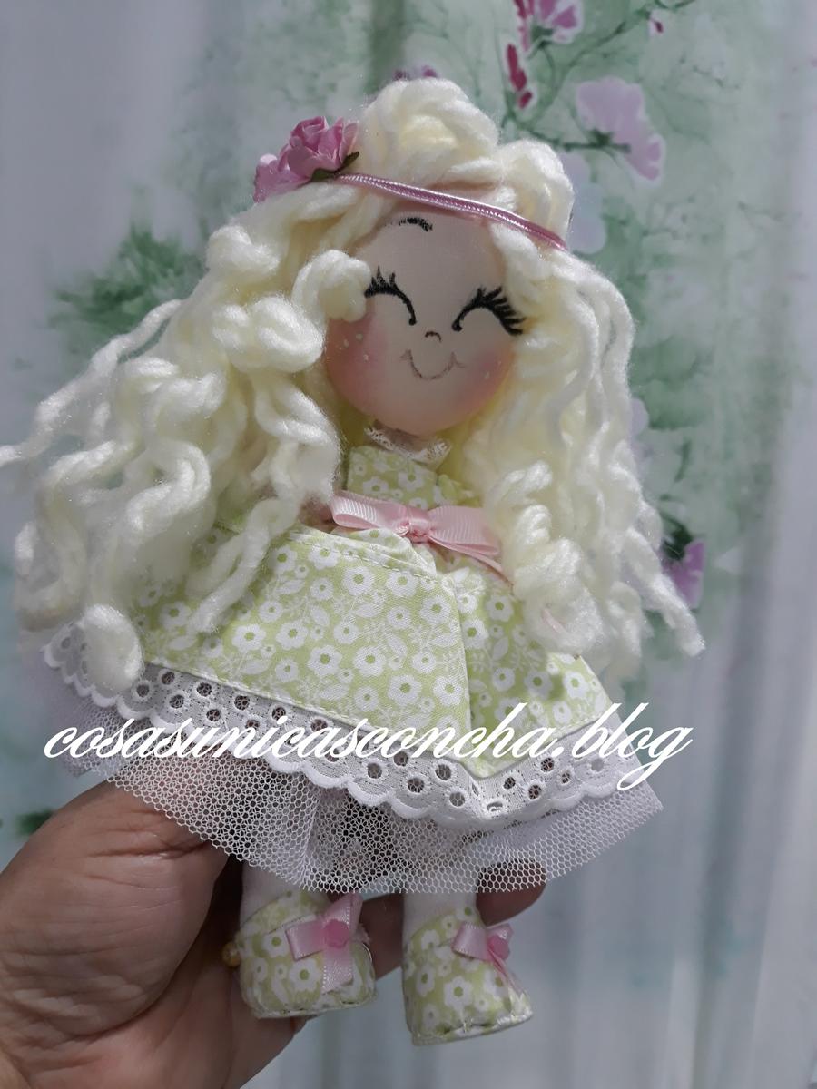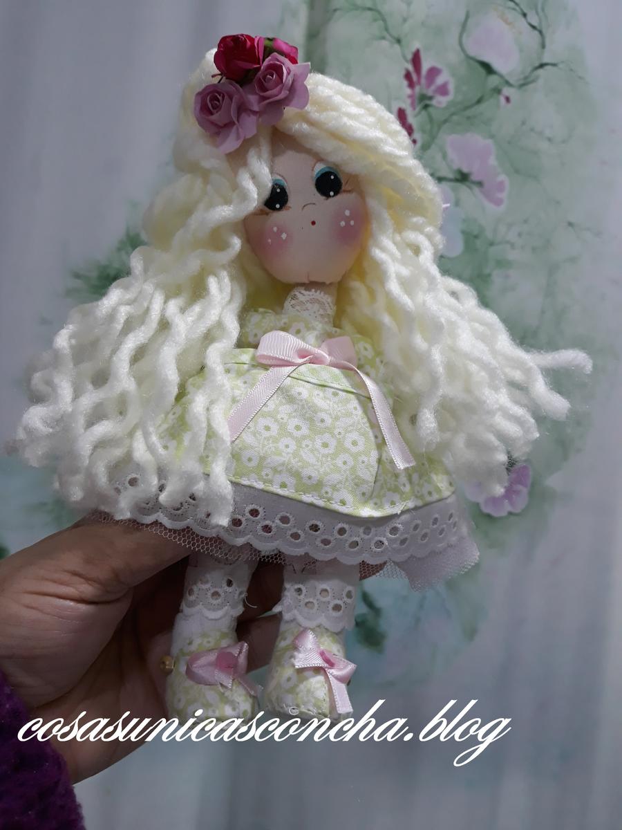 En esta entrada os dejo unas muñequitas de trapo pequeñitas, realizadas completamente a mano y con todos los detalles, el vestido es de batista rematado con una puntilla de cinta bordada y con un “” gran “” bolsillo, en los pololos también llevan puntilla en las patas y un lacito en la parte delantera al igual que los zapatos, el pelo es de lana y adornado con una corona de flores, la carita está pintada y todas diferentes y la muñeca se puede colgar y utilizarla como adorno o para poner las llaves o carmines, pinzas de depilar o limas de uñas, en fin hay que usar la imaginación porque en cualquier sitio quedaran preciosas.