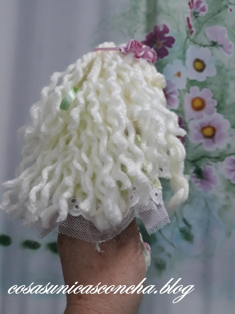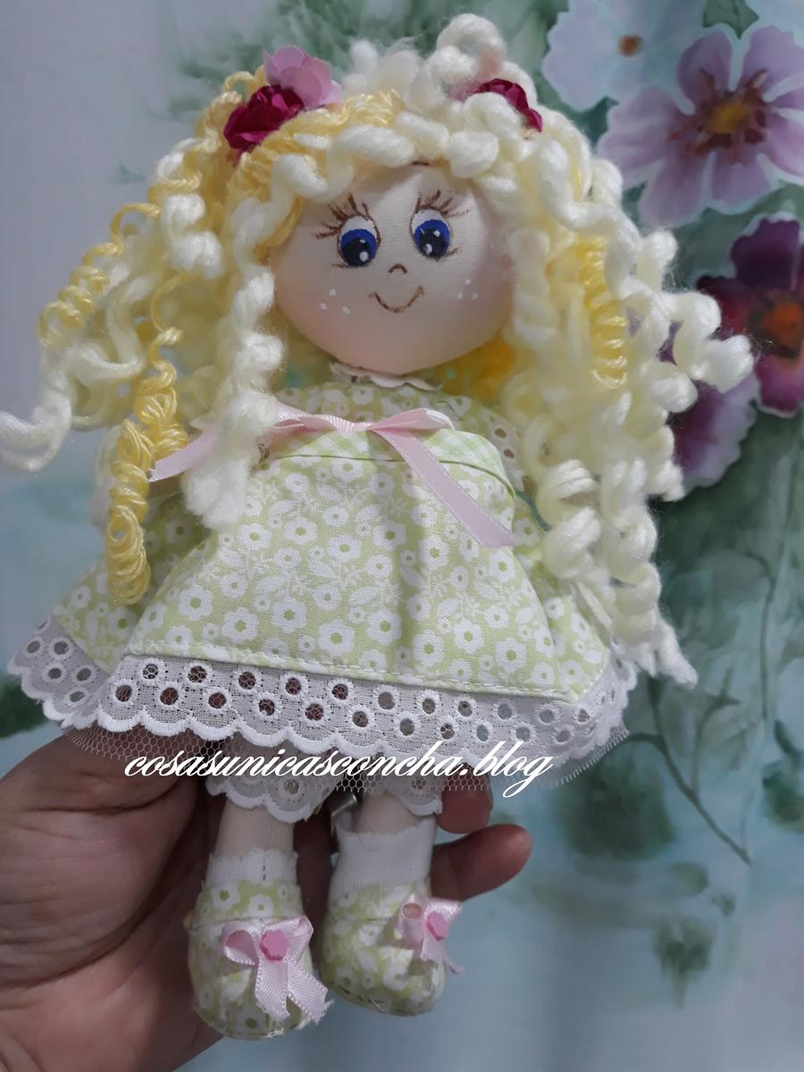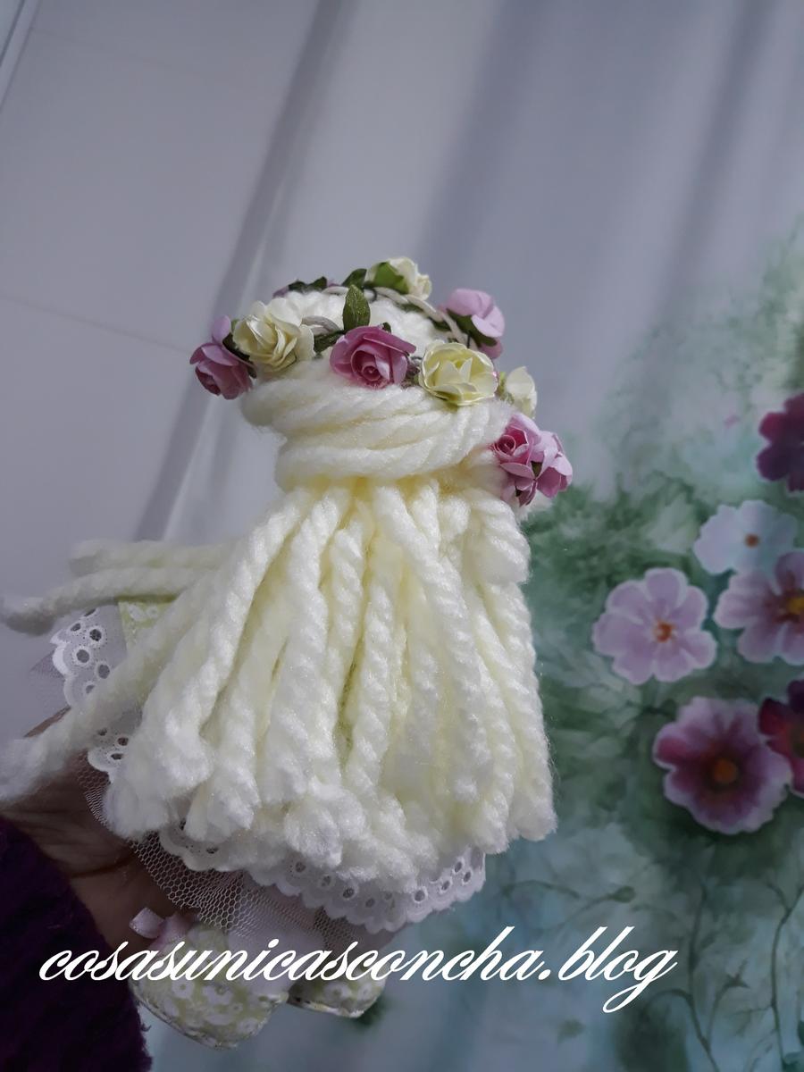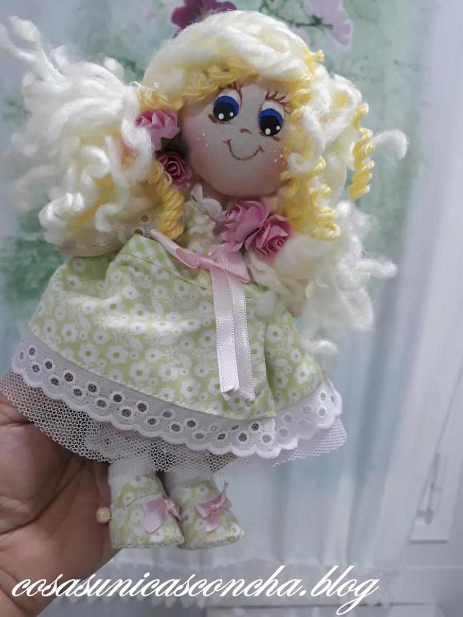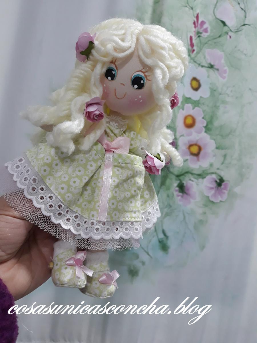 En esta entrada os dejo unas muñequitas de trapo pequeñitas, realizadas completamente a mano y con todos los detalles, el vestido es de batista rematado con una puntilla de cinta bordada y con un “” gran “” bolsillo, en los pololos también llevan puntilla en las patas y un lacito en la parte delantera al igual que los zapatos, el pelo es de lana y adornado con una corona de flores, la carita está pintada y todas diferentes y la muñeca se puede colgar y utilizarla como adorno o para poner las llaves o carmines, pinzas de depilar o limas de uñas, en fin hay que usar la imaginación porque en cualquier sitio quedaran preciosas.
