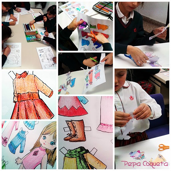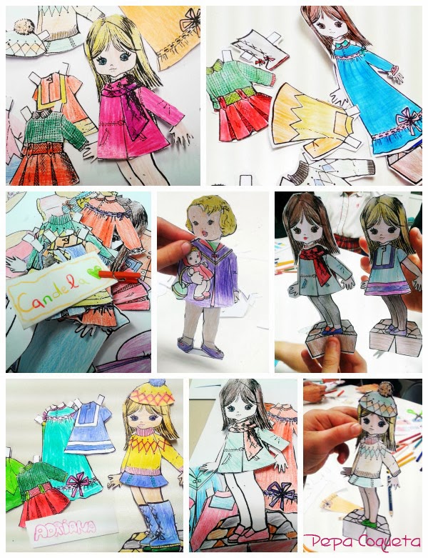 Por fin terminaron de recortar la muñecas y los vestiditos, sombreros y demás complementos. Y jugaron como lo hacíamos nosotras, el mismo entusiasmo,... ainssss... qué recuerdos!! El primer día está contado aquí. Las más pequeñas no llegaron a terminar, tenían una muñeca un poco más infantil, espero que ya las hayan recortado en casa...