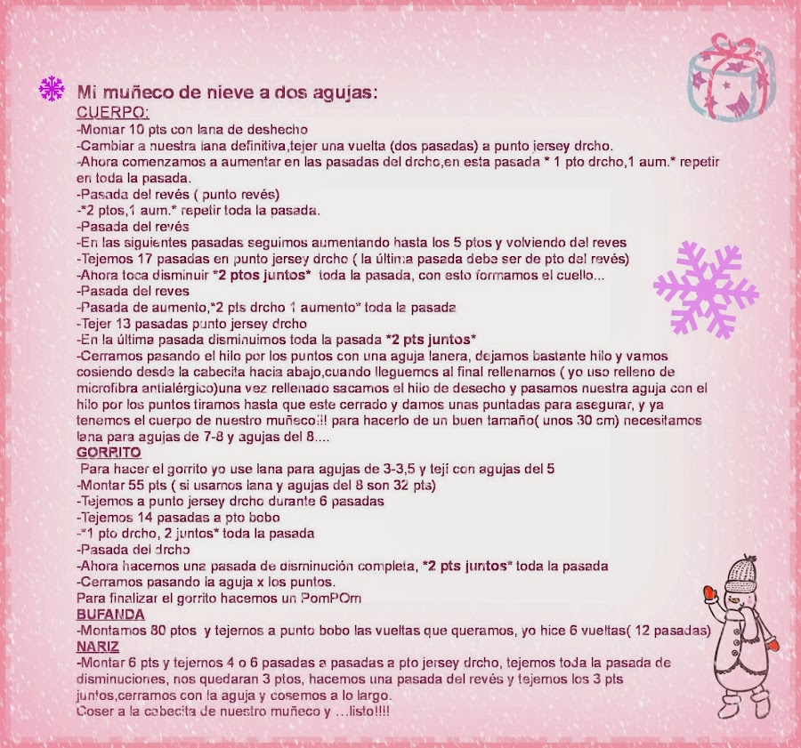 Por fin! ya tocaba una entrada navideña, aunque he de confesar que no soy mucho de decoraciones navideñas y demás...pero este año por primera vez hicimos un taller navideño en las clases de calceta, todas juntas decidimos hacer este muñeco de nieve que os muestro a continuación...la verdad es que no lo dimos acabado en la clase y será esta semana cuando lo terminen...yo no lo pude evitar y acabé el mío en casa...os dejo el patrón que nos dio la profe y os animo a que lo hagáis, es súper fácil y bastante rapidito...y si ya no os da tiempo este año pues os lo guardáis para el año que viene...queda ideal!!! La lana recomendada es la de agujas del 7-8 y las agujas del 8, y para los complementos lo mismo, solo que yo como veréis en las fotos, solo use lana gordita para el cuerpo...para la bufanda ,para el gorrito y la nariz use la lana eco que suelo utilizar para los amigurumis con agujas del nº 5...en el patrón os indico el nº de puntos a tejer en ambos tamaños de aguja...para los ojos use dos bolitas de abalorio negras, y los botones los aproveche de un abrigo q tenia al que se los cambié...mas aprovechada imposible!!! Y ya sabéis que cualquier duda que tengáis acerca del patrón podéis preguntar!!! Ah!!! y con esta fiesta participo en la fiesta de enlaces de personalizacion de blogs