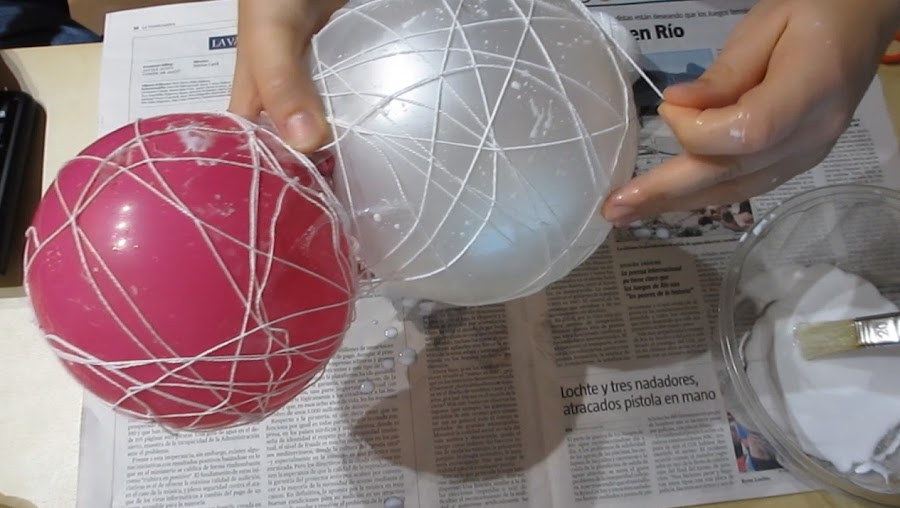 Después pasamos a barnizar los globos con la mezcla y vamos enrollando los globos con el hilo blanco. Podéis ir enrollando los globos con trozos de hilo previamente cortados o con el ovillo. Al principio lo hice a trozos, pero por rapidez pasé a enrollarlo con el ovillo y me fue bien, siempre que procuremos que no se lié el hilo ;D