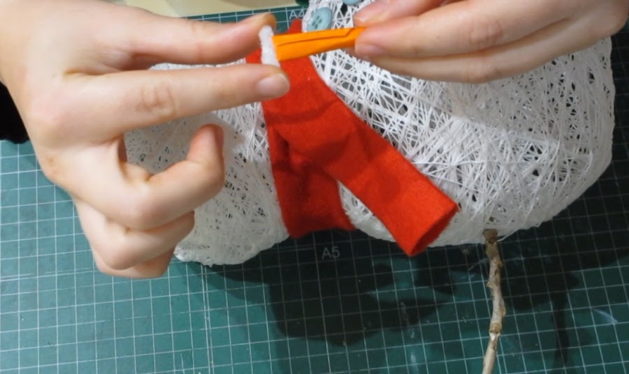 Cuando tengamos todos los elementos decorativos pasamos a pegarlos con silicona. Pegamos: los ojos, los botones, la bufanda la pegué alrededor del cuello y unos puntos de silicona en la unión de los dos trozos para darle forma y por último la boca que es un trozo de pulsera de "scobydoo", pero también podéis utilizar cuerda.