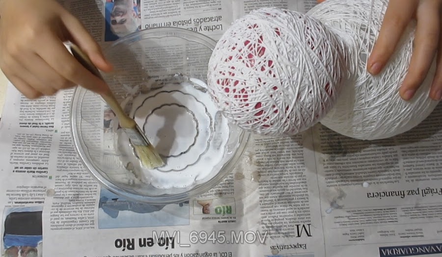 Después pasamos a barnizar los globos con la mezcla y vamos enrollando los globos con el hilo blanco. Podéis ir enrollando los globos con trozos de hilo previamente cortados o con el ovillo. Al principio lo hice a trozos, pero por rapidez pasé a enrollarlo con el ovillo y me fue bien, siempre que procuremos que no se lié el hilo ;D