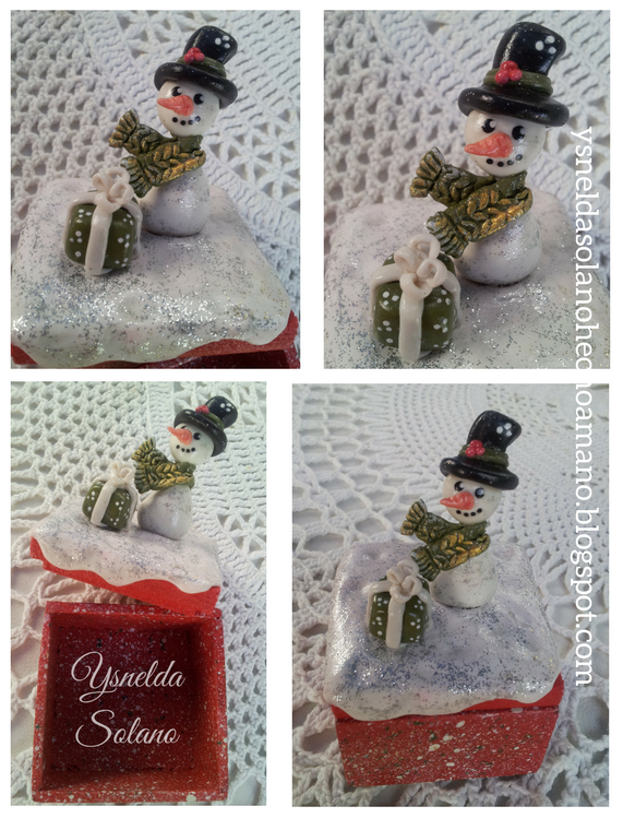 5.- El pequeño Muñeco de Nieve, decora un cofre rojo (Con pintura acrílica pinté el cofre). Con porcelana fría blanca cubrimos la tapa simulando una capa de nieve que resbala por las orillas de la tapa.
