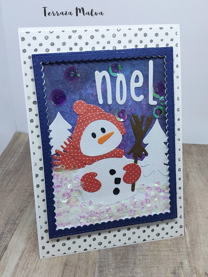 El hombrecito de nieve va abrigado con unos restos que he aprovechado de una cartulina roja de topos que he usado en una tarjeta anterior.
