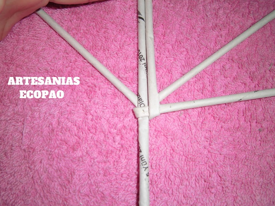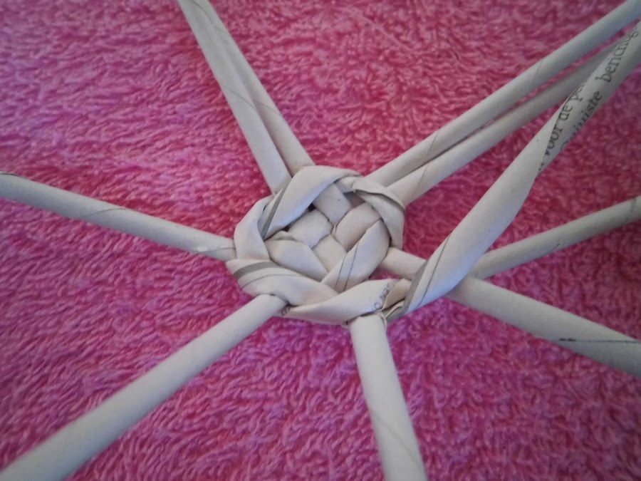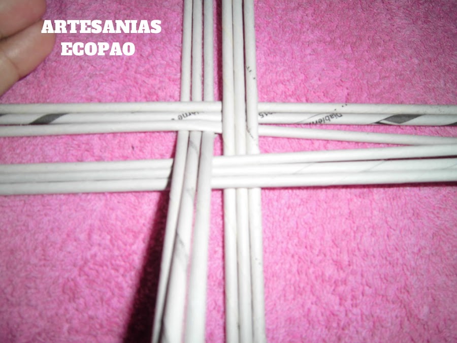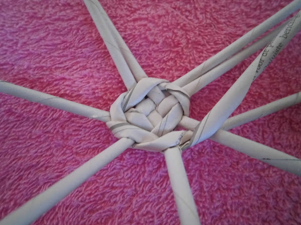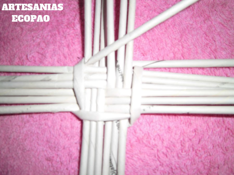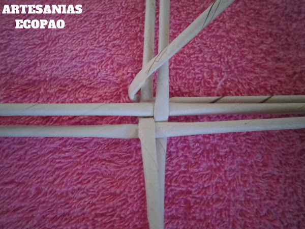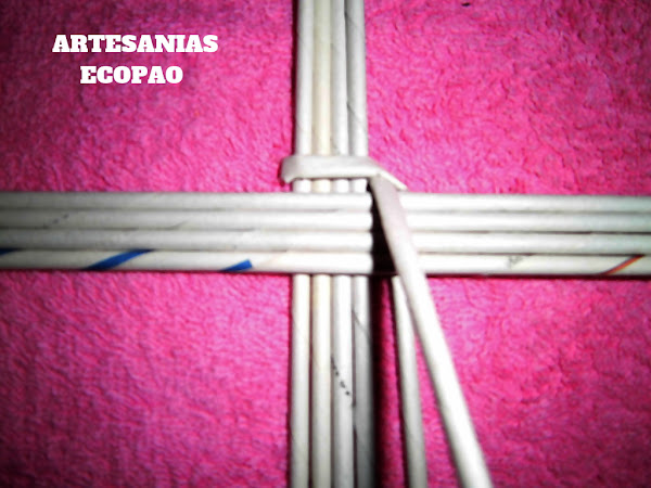 Formamos una cruz con 4 rollitos de cada lado y comenzamos a tejer con otro rollito doblado por la mitad.