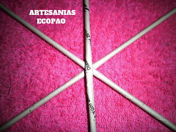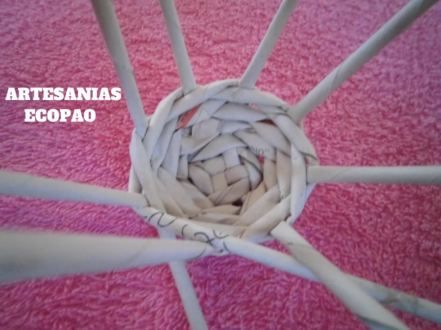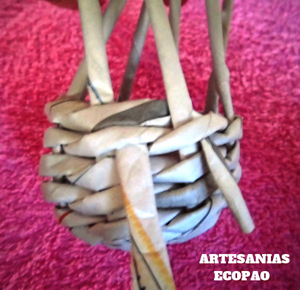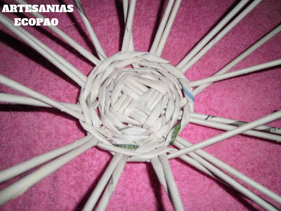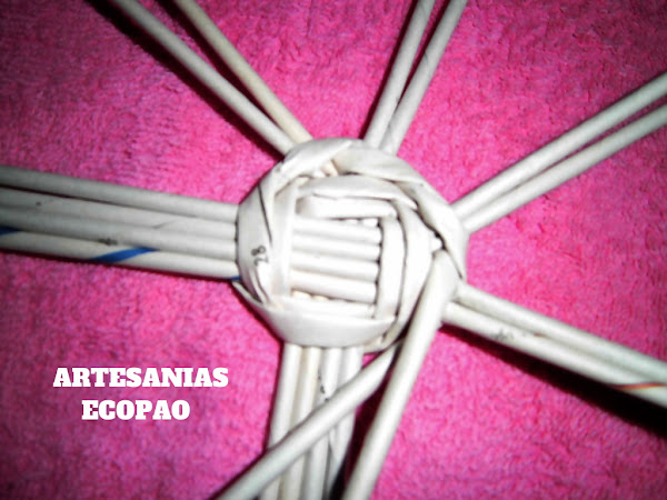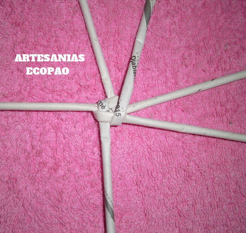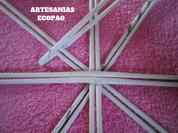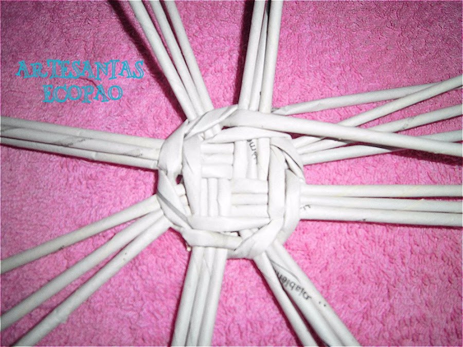Formamos una cruz con 4 rollitos de cada lado y comenzamos a tejer con otro rollito doblado por la mitad.