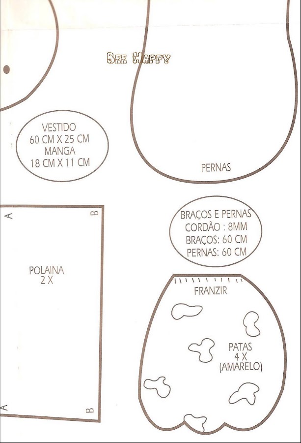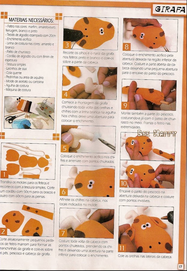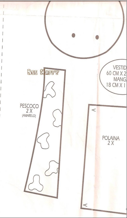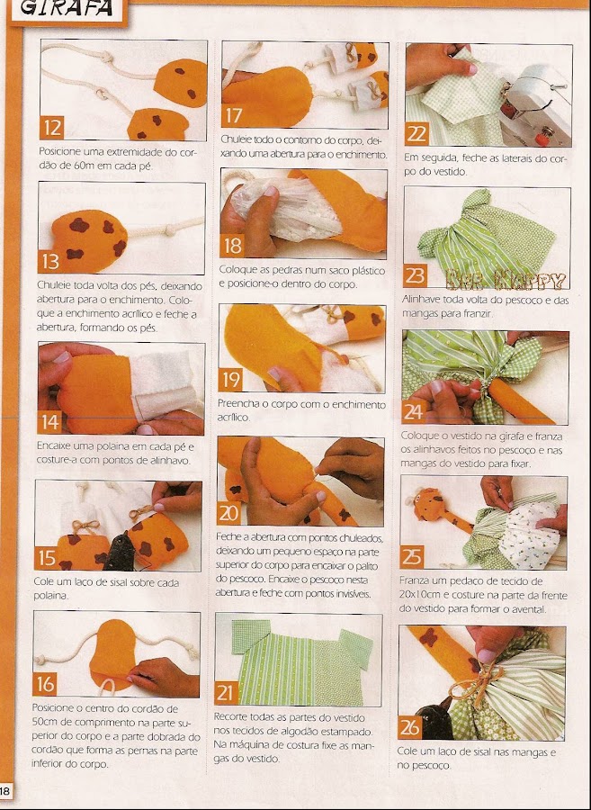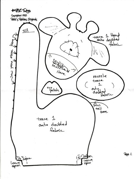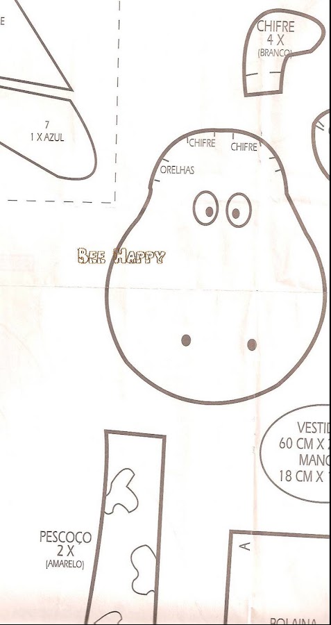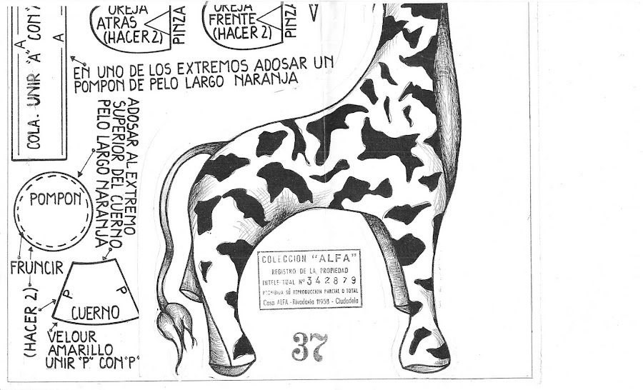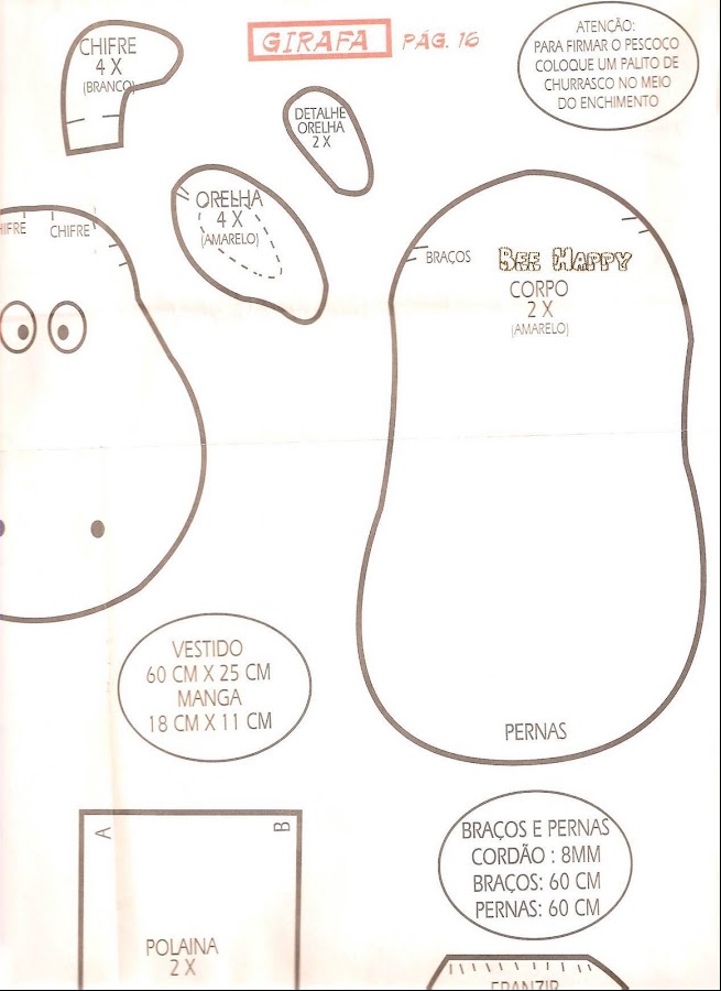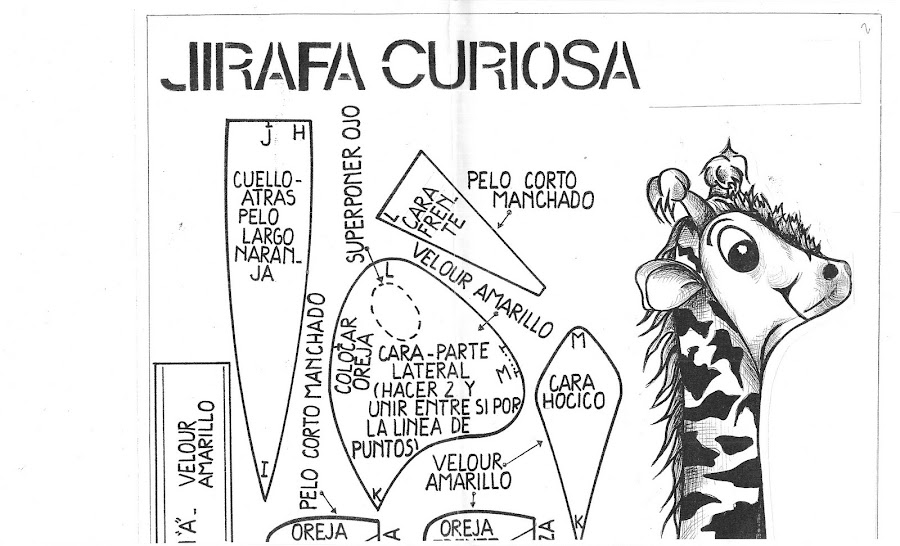 Primero cortar 2 moldes del cuerpo,luego 4 moldes para las orejas,y para unir los pies de la jirafa solo cortar 1 molde y coser a máquina o a mano ,si lo haces a mano preferible usar fieltro .El tamaño de la jirafa es de 25 cm x 10 cm .