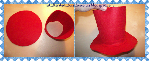 5.Ahora recortamos un rectángulo de 40/45 cm de largo y lo pegamos ,de manera que una parte la pegamos un poquito más adentro que la otra,recordar que es un sombrero de copa,uno de las partes es más estrecha,y pegamos con el ala de nuestro sombrero.