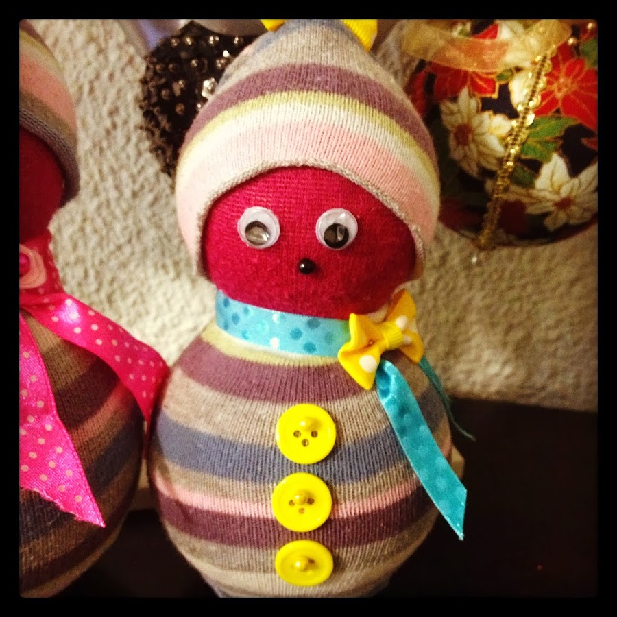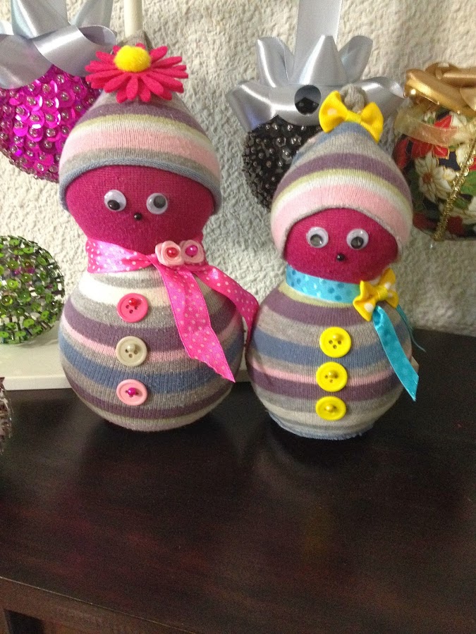 Hoy aprovechando unos leotardos de mis niñas que ya no le valen, he hecho unos muñecos de nieve.