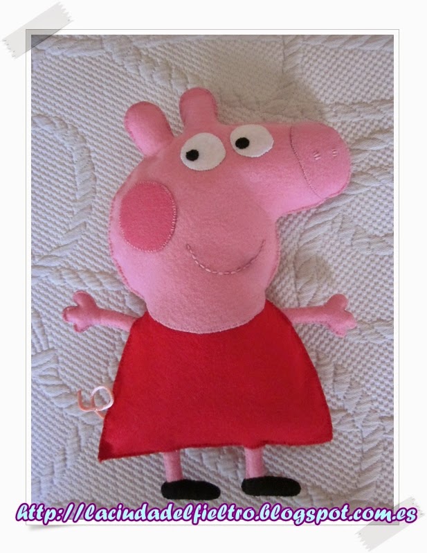 Después de unos días cosiendo y cosiendo (para que se pueda lavar y no haya problemas para una niña pequeñita con pegamentos y eso) aquí dejo a Peppa Pig: