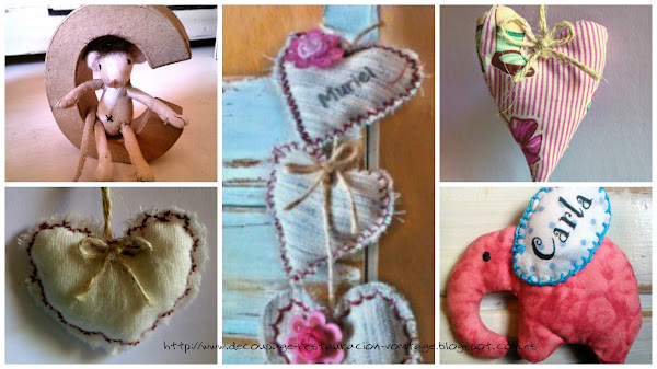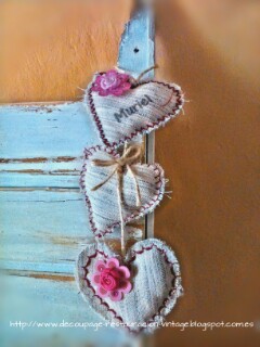 Los corazones están cosidos con unas puntadas decorativas de la máquina de coser y también rellenados con algodón. El nombre también es un transfer.