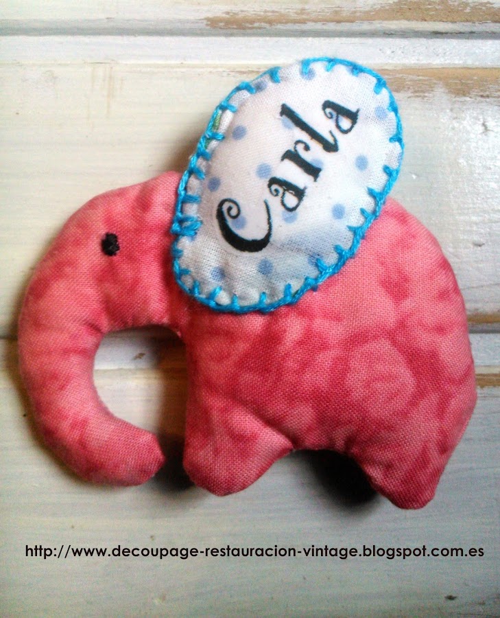 El elefante es un patrón muy sencillo, está cosido a máquina, el cuerpo y la oreja por separado. Se cosen por el revés en todo el perímetro menos un par de centímentros para poder darle la vuelta y se acaba de cerrar a mano. Para rellenarlo y darle la vuelta a la tela, también usé la aguja de ganchillo. El nombre se lo puse con transfer: