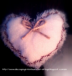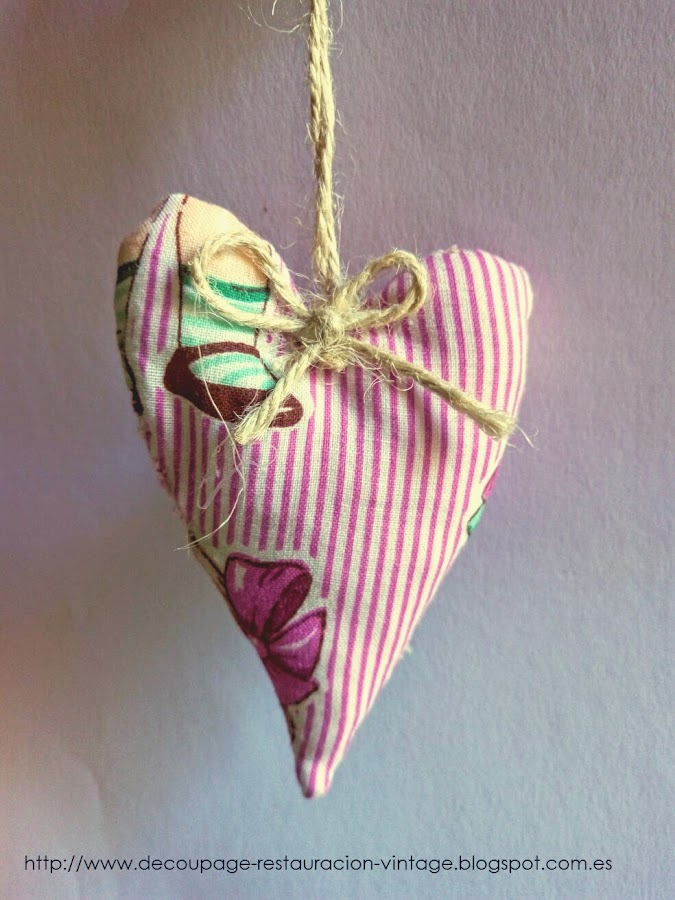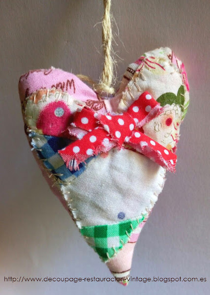 Este otro está hecho con un intento de patchwork con la máquina de coser. Es un esquema que cogí de la página http://www.feltromara.blogspot.com.es Son cuatro trozos que se cosen entre sí y luego se unen a un corazón grande. En la foto no se distinguen los cuatro trozos de tela.