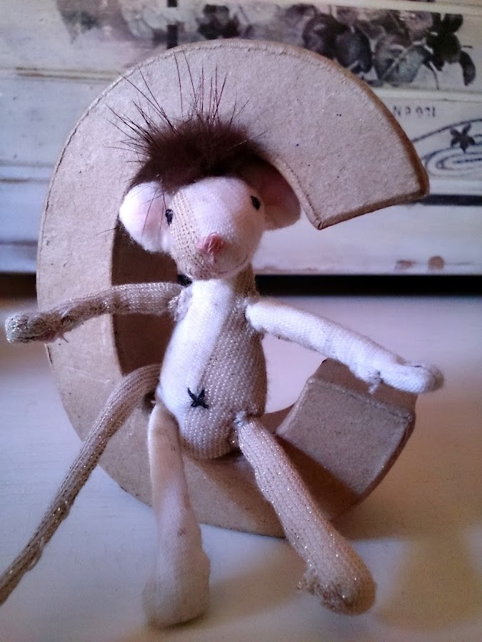 El ratoncito está hecho a mano, sin seguir patrón. Fui recortando los trozos de tela a ojo para hacer cada parte del cuerpo. Está cosido del revés y después rellenado con algodón de discos desmaquillantes, ayudándome de una aguja de ganchillo para apretarlo. A cada parte del cuerpo le iba dando la forma mientras la cosía. Empecé por la cabeza y luego el cuerpo. Los uní y después fuí cosiendo los brazos, las patas, las orejas y la cola. Le hice dos ojillos negros, una nariz rosa y un ombligo con punto de cruz. La verdad es que me parece que quedó muy graciosillo.