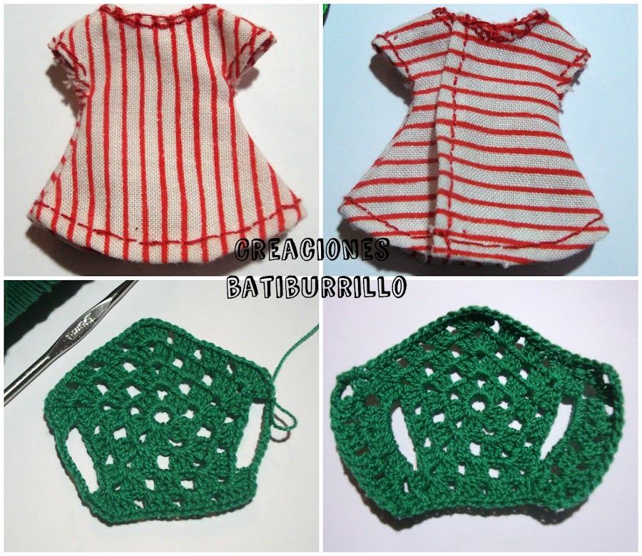 Yo, de momento le he hecho un vestido de rallas de corte trapecio que cierra por detrás, y una chaqueta de ganchillo con un lazo a conjunto con los del pelo.