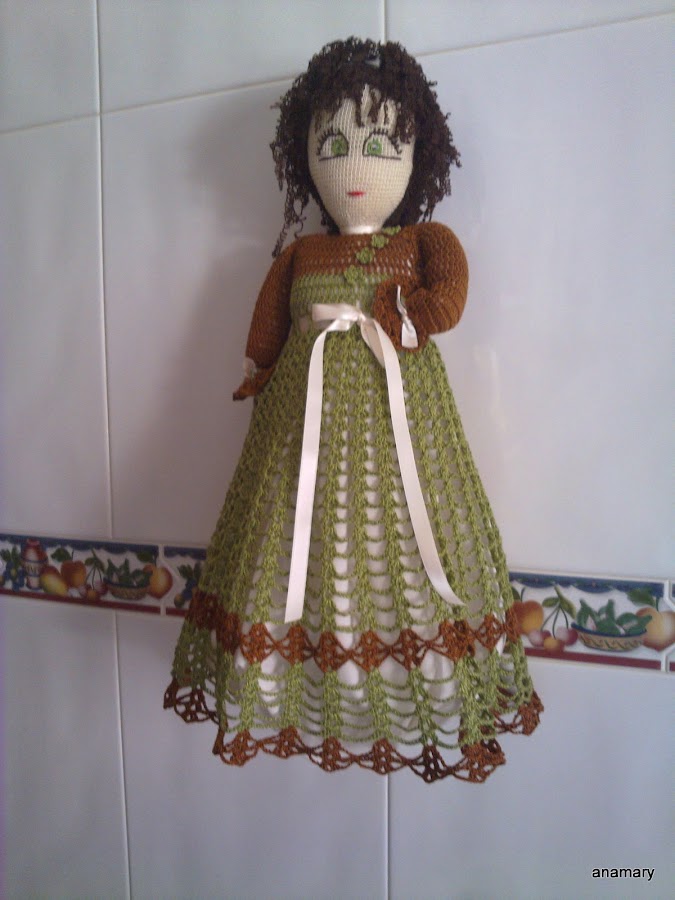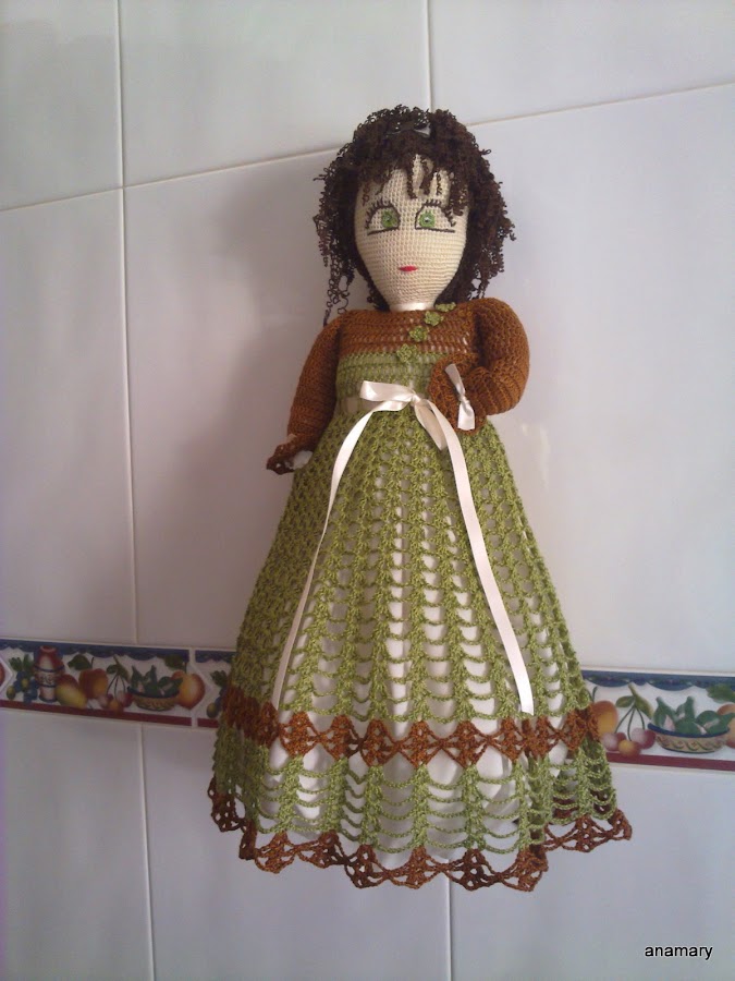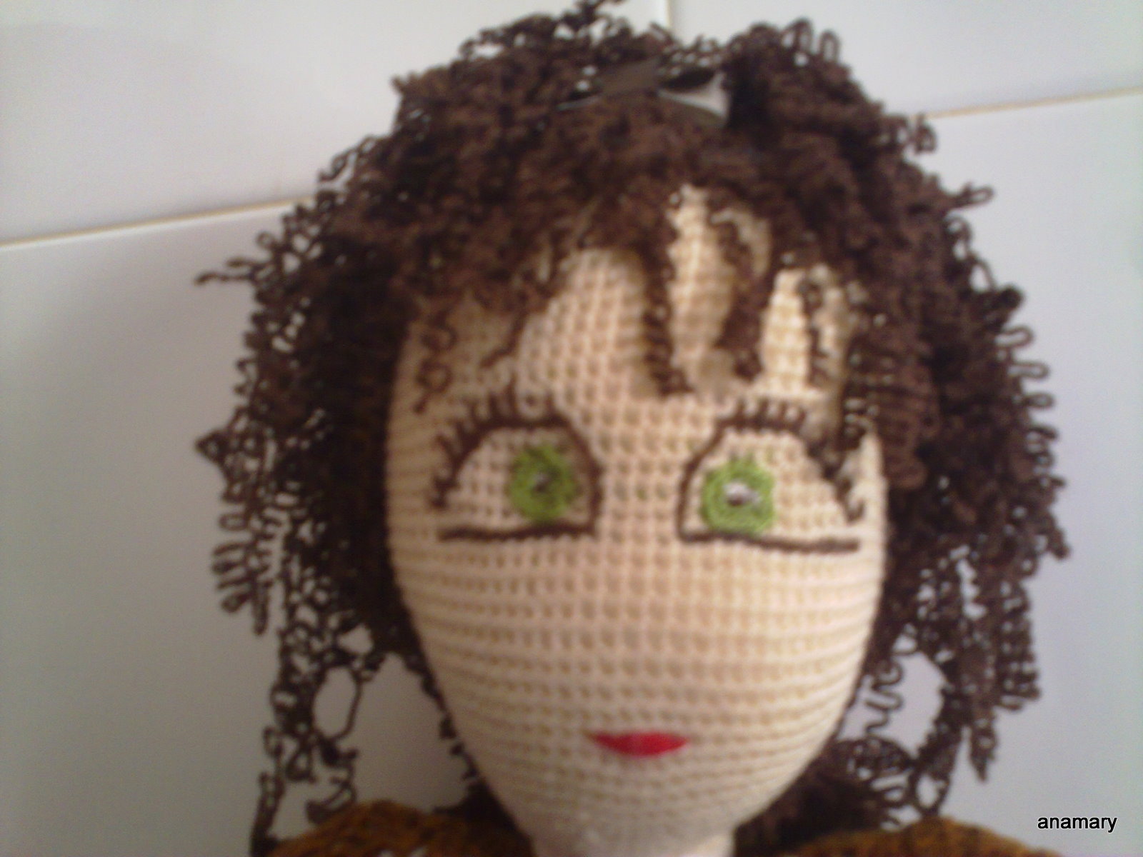 ...esta muñequita lleva el pelo rizado...para rizar el pelo de la muñeca tricotar la lana y plancharla bien ,podemos tricotar en punto bobo(vueltas todas del deecho),la dejamos unas horas y después deshacemos el tejido,lo cortamos en hebras del largo deseado y se lo colocamos a la muñeca......