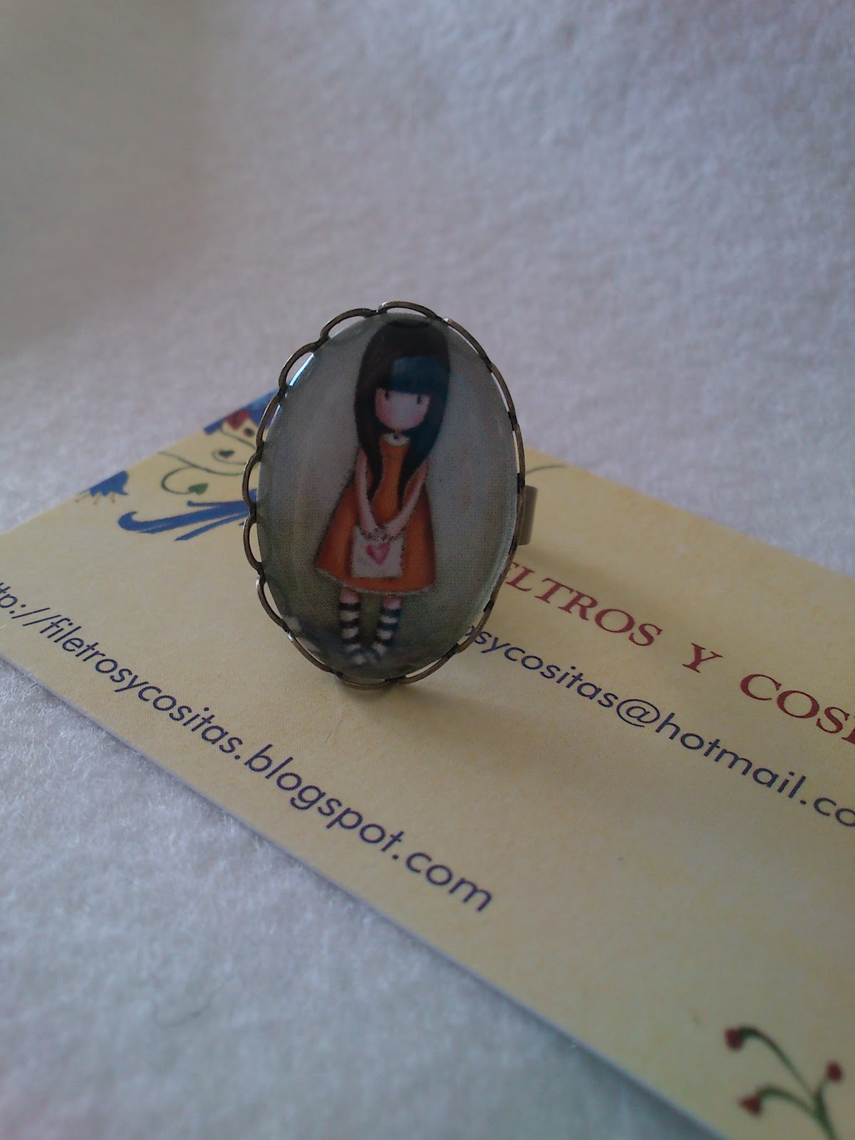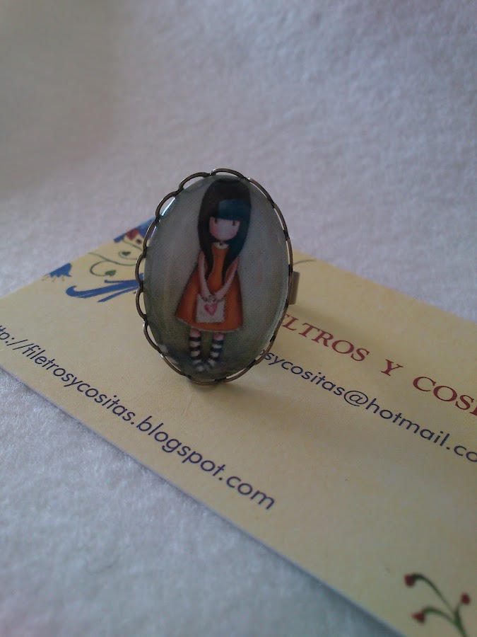 Hoy traigo unas piezas de bisutería con imagenes de muñecas gorjuss con ilustraciones de Suzanne woolcott, los primeros son unos camafeos y una alfiler de 3 agujeros adornado con charms, y el ultimo es un anillo ajustable a cualquier medida, os gusta el resultado???....