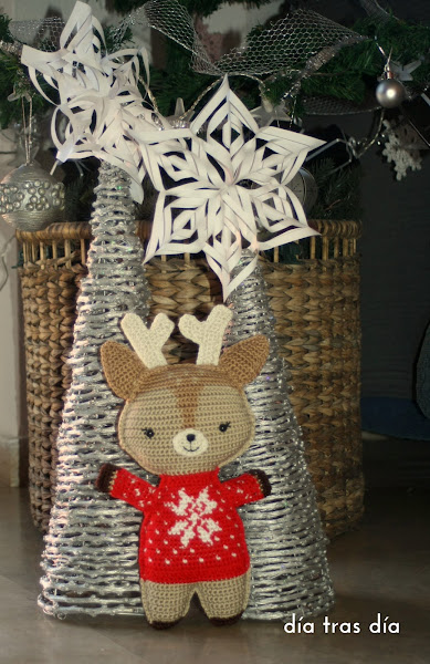 ¿Qué os parece? Creo que al final he conseguido que quede bastante parecido al original. Pero os cuento un secreto: pensaba haber hecho los dos renos, el del chaleco rojo y el del chaleco verde. Sin embargo, al menos a día de hoy, os digo que de momento me voy a quedar sólo con este. Y es que, después de probar esta técnica para tejer muñecos, creo que voy a volver a los amigurumis. Igual es cuestión de cogerle el truco y practicar, pero me ha resultado un trabajo muy lento y, sobre todo el momento de unir las piezas, me ha parecido especialmente pesado y tedioso. Mientras estaba haciéndolo, llegué a plantearme abandonar el trabajo, y de hecho lo tuve un tiempo parado sin seguirlo, pero como soy un poco cabezota, finalmente decidí que tenía que acabarlo. Y al final me he alegrado de haberlo hecho :-D