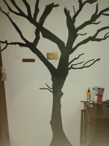 Yo lo que he hecho es darle primero una base acuosa de negro para que no se me transparente el color de la pared y me apareciesen rayas, ya que la pintura que he gastado no cubre mucho (por eso os recomendaba dar varias pasadas) y el color del tronco original es negro.