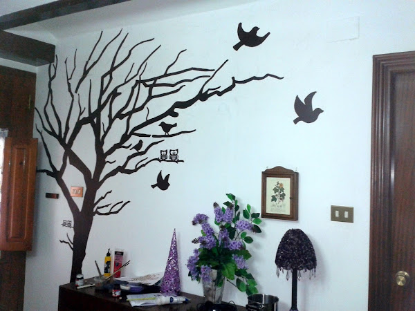 Os quiero mostrar el último mural que acabo de pintar. Se trata de simular un vinilo de los que venden de decoración pero en lugar de ello hacer una imitación pintándolo con pintura acrílica sobre la pared.