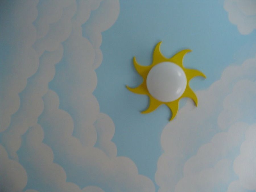 Pecosapon aporta una idea original: en vez de las paredes, decidió pintar el techo, ya que los bebés normalmente miran hacia arriba. “Lo hice con acrílica blanca y una paletina, subiendo y bajando un montón de veces por la escalera”. La lámpara disfrazada de sol es un plafón, y los rayos están recortados en tablero DM, lijados y finalmente pintados también con esmalte acrílico.