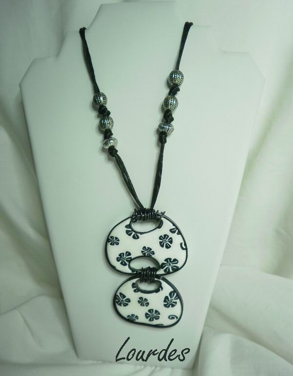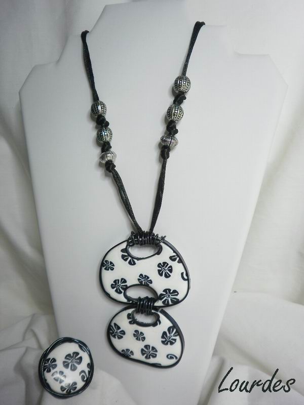 Otro conjunto con la murrina flor negra Este collar largo con cuentas cojín y adornos en plateado con cadena de cuadrados Puedes ver como hice las cuentas cojín en este PAP El anillo lleva mis flores a un lado y unas piedras negras al otro para completar su composición Y aquí podéis ver el conjunto al completo