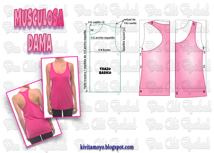 Trazar la camiseta basica a medida y sobre ese patron, diseñar la musculosa deportiva para dama. En mitad de hombro dibujar un bretel de 3cm. Cavar el escote unos 20 cm, casi a la altura de la sisa ( esto es a gusto) Bajar en la sisa 3 cm y entrar desde el lateral 1 cm. Acentuar a la altura de la cintura 2 cm y bajar 4 cm en los bajos desde le lateral. En el centro delantero bajar 5 cm. Usar solo generos de punto. El modelo lleva un ribeteado en las aberturas de cuello y sisas.