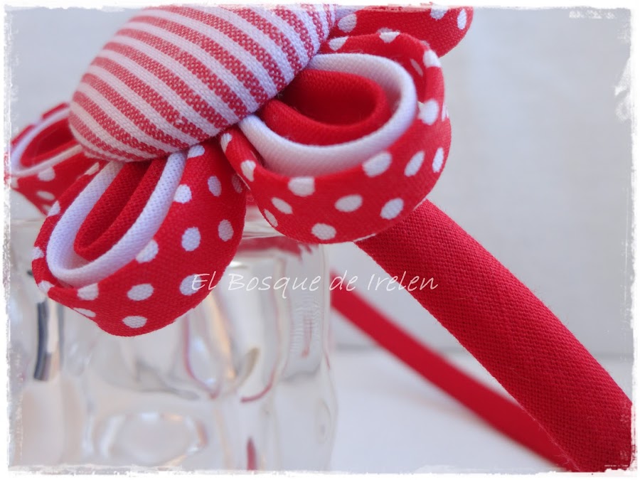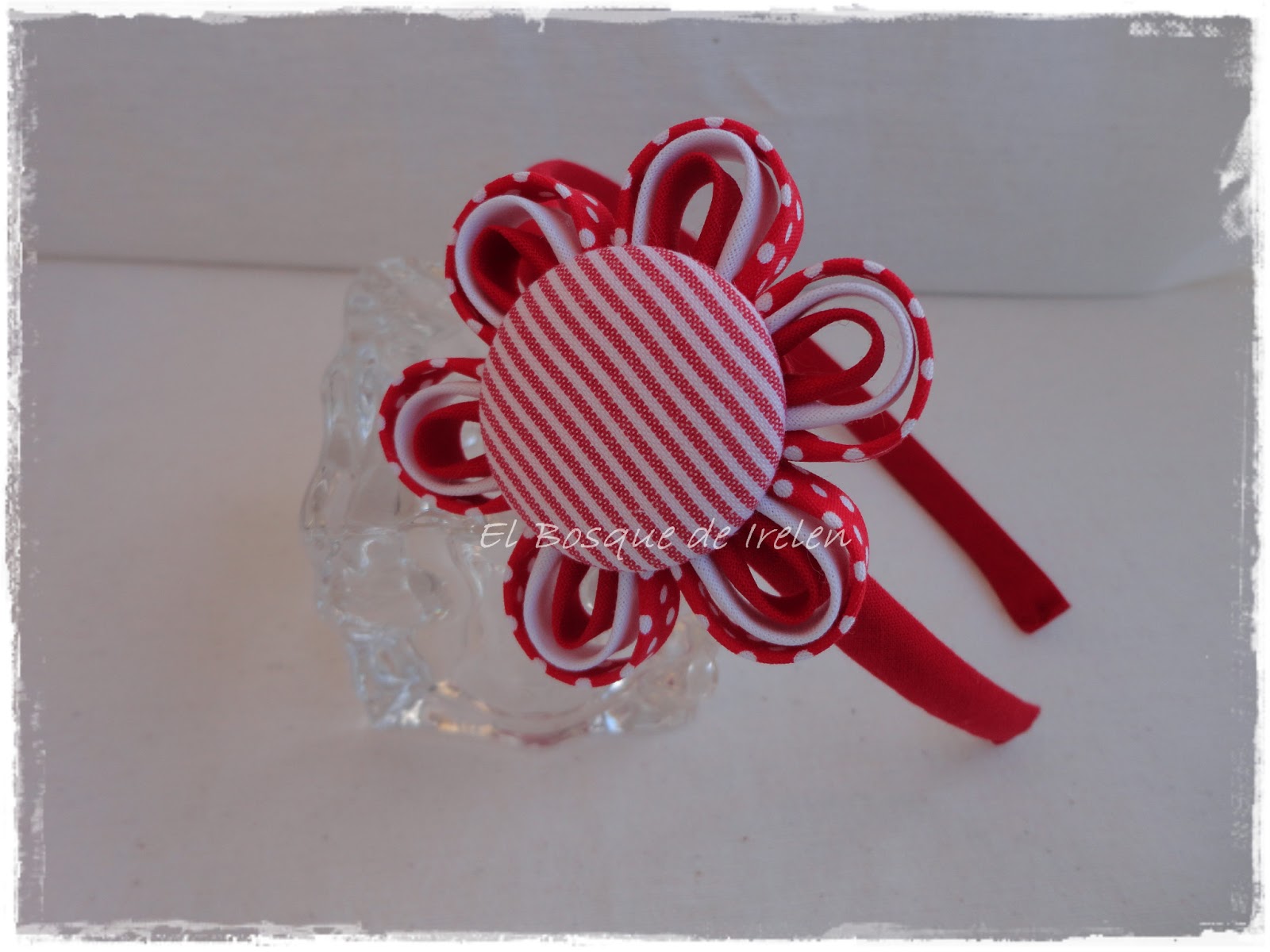 Diadema flor bies lunares con botón grande forrado en rayas rojas
