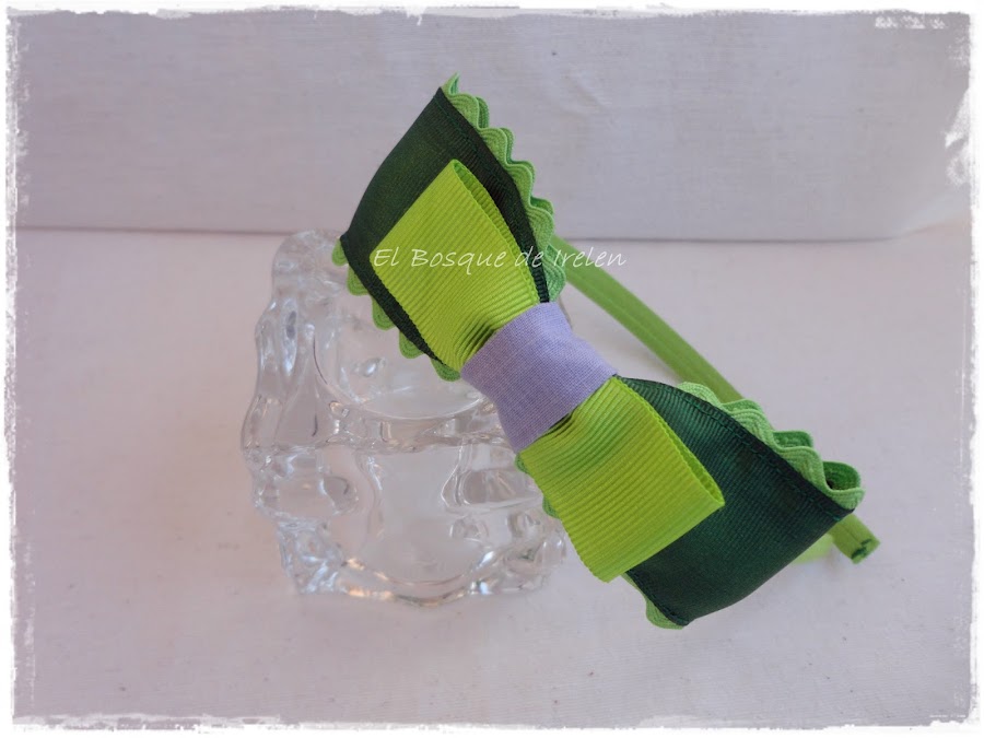 Diadema lazo doble con adorno de piquillo en tonos pistacho/botella