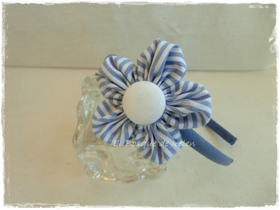 Diadema flor rayas celeste con botón forrado en blanco y base en azul