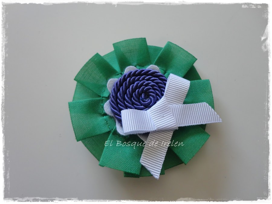 Pinza plisado verde andalucía, centro con espiral violeta y adorno de lacito