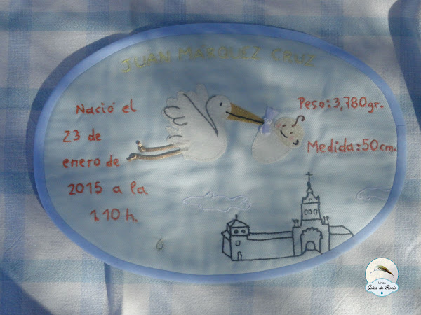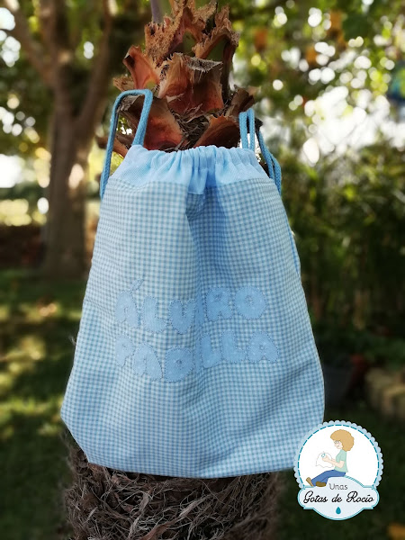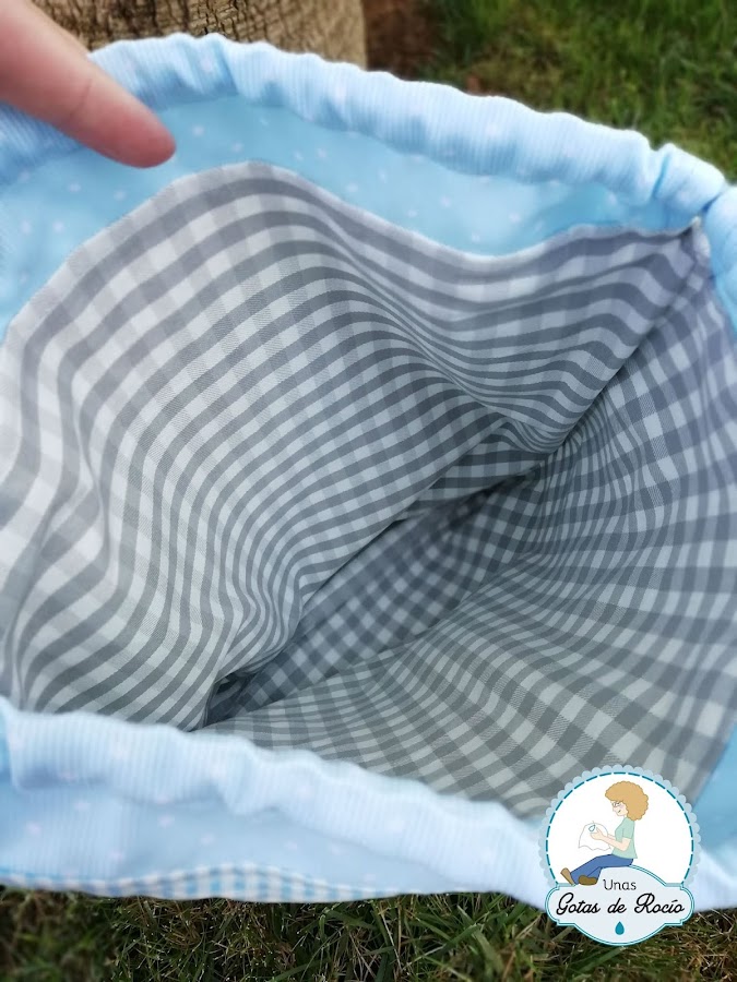 Para un niño algo mayor, pues ya es grande y va al cole he preparado esta mochila tipo taleguilla. En tonos azules muy suaves y con forro en loneta vichy gris y blanca.