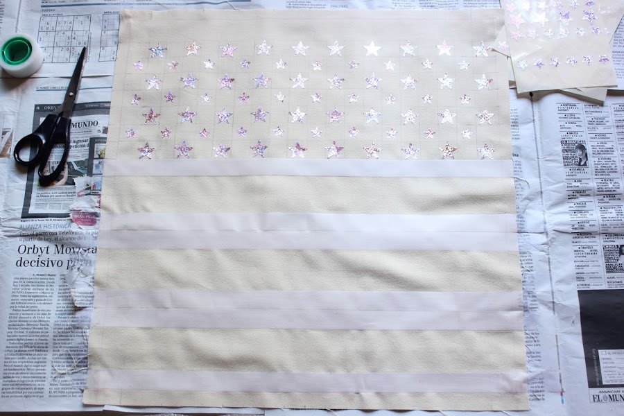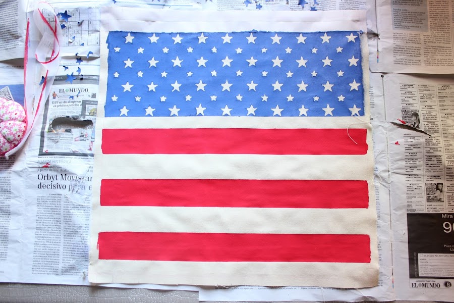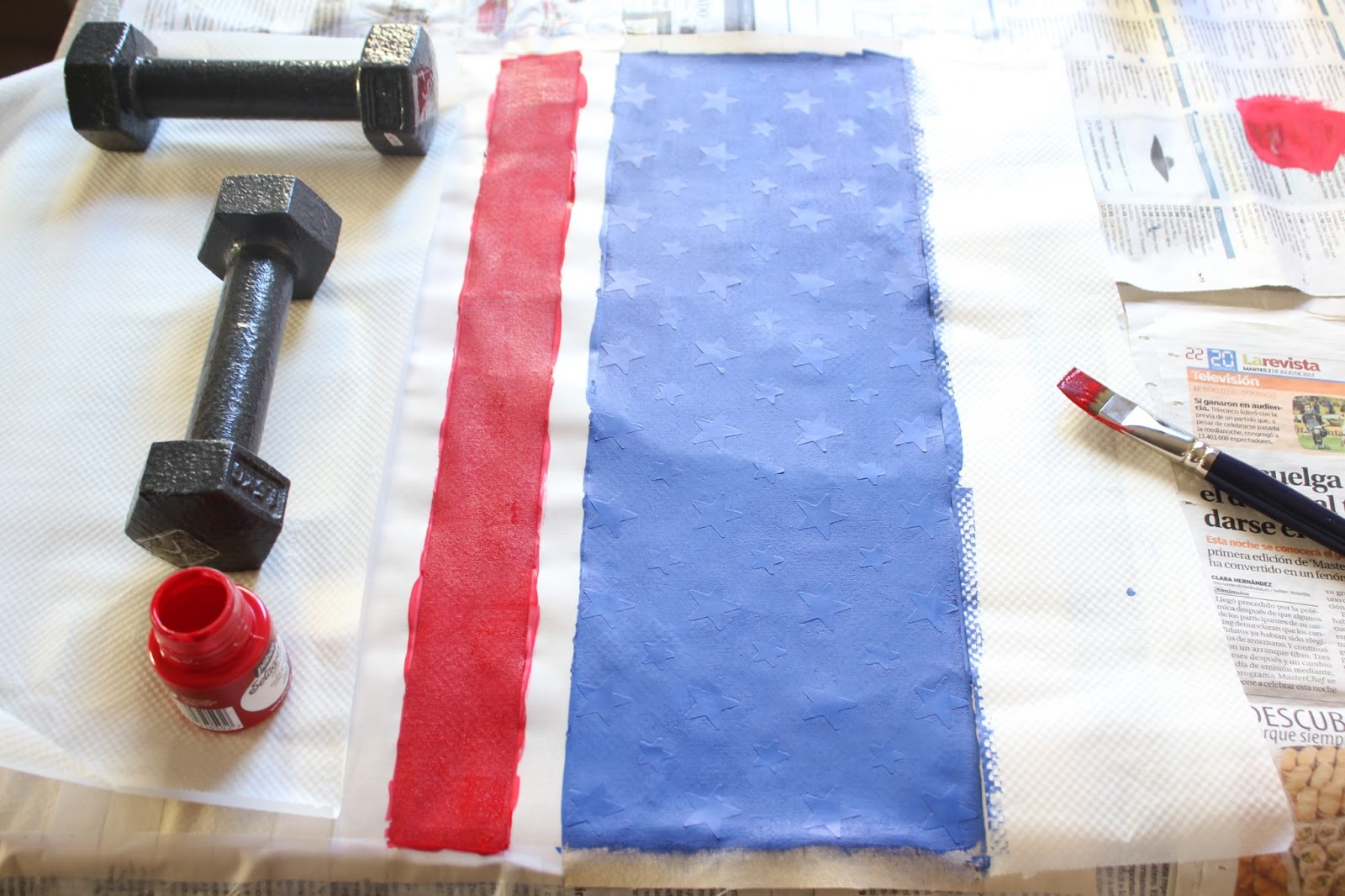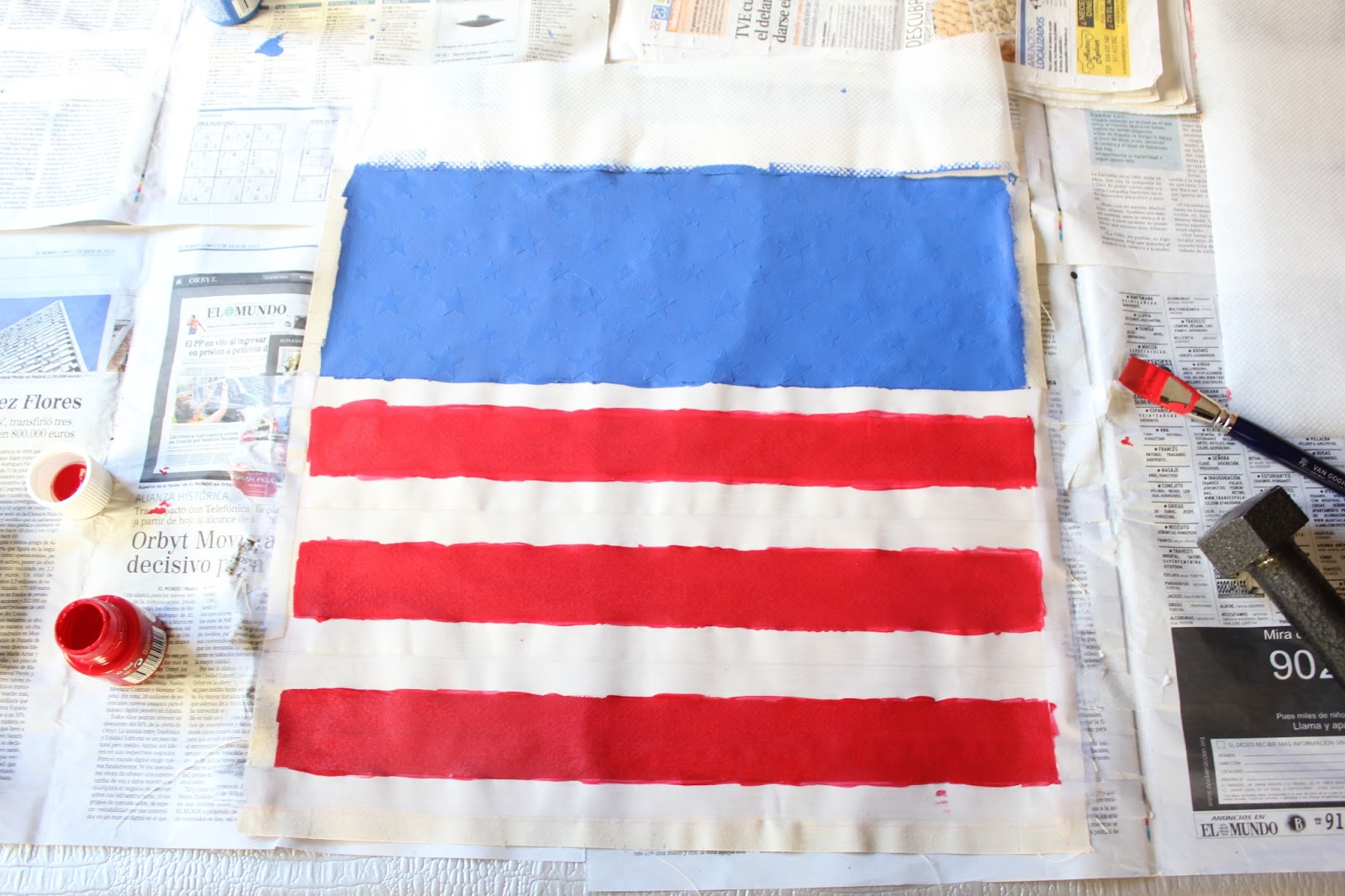 Hace unos meses paseando por un centro comercial aquí, en Madrid, vi un cojín muy bonito con la bandera americana estampada pero que costaba una barbaridad. Pensé en hacer uno parecido para mi salón pero por cosas de la vida, dejé el proyecto de lado; hasta que ayer me desperté pensando hoy quiero pintar (jajaja tal cual!). Así que aprovechando que fue la fiesta del 4 de Julio decidí hacer un cojín inspirado en el que había visto, con estrellas y bandas pintadas sobre una tela de algodón.
