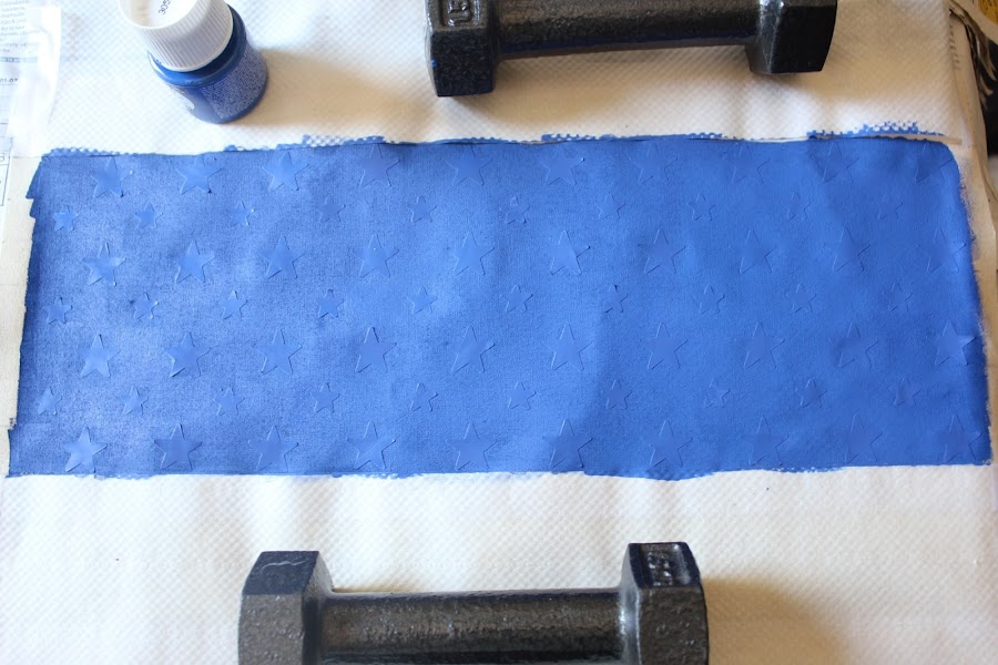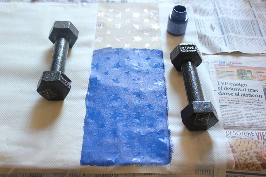 ? Pintamos por encima del rectángulo con las estrellas, una primera capa de pintura azul y dejamos que se seque al aire libre durante 1h.