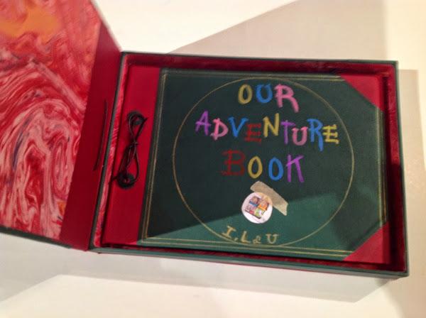 Conjunto de caja y álbum de fotos Our Adventure Book, basado en My Adventure Book de la película Up. En esta ocasión, realizado en simil piel, negro y azul y personalizado en la portada y contraportada
