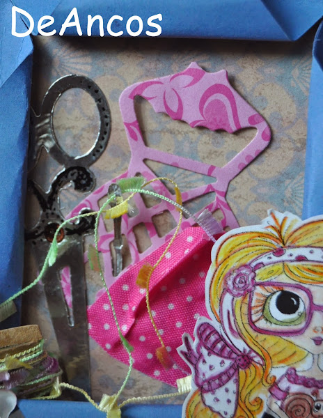 Troquelé la tijera y la aguja en lámina de aluminio en la que enhebré un hilo de fantasía. El vestidito de Spellbinders se supone que está a punto de terminar de confeccionarse y el trocito de tela adhesiva puede ser utilizado para ello.