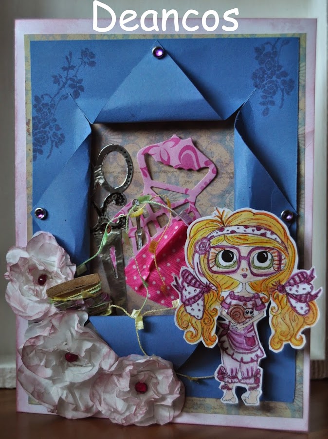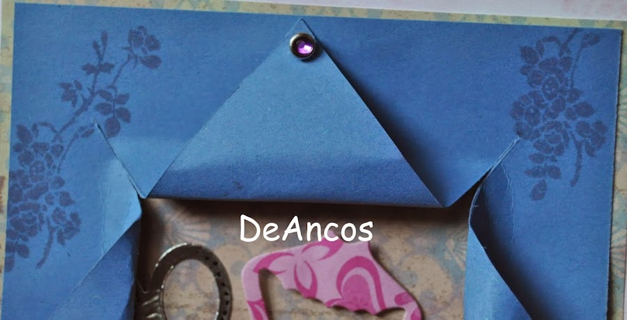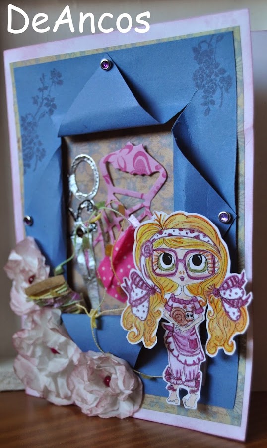 Después corté una cartulina azul y abrí en ella una "especie de ventana" desde donde se verían los elementos de costura. Cogí la idea de un troquel de Sizzix.