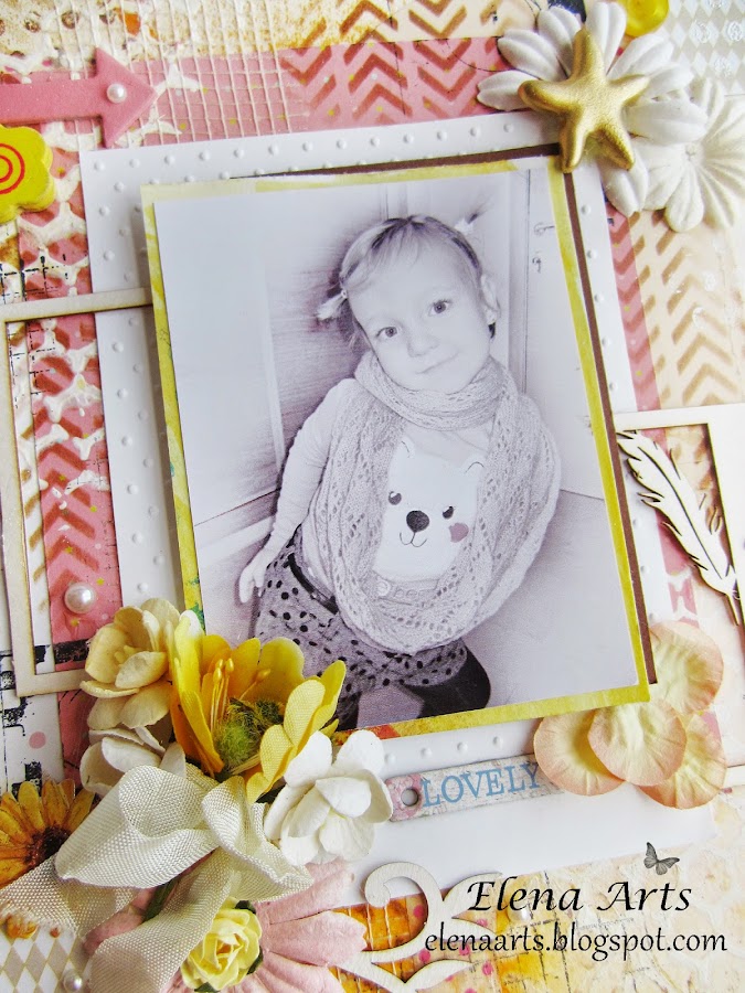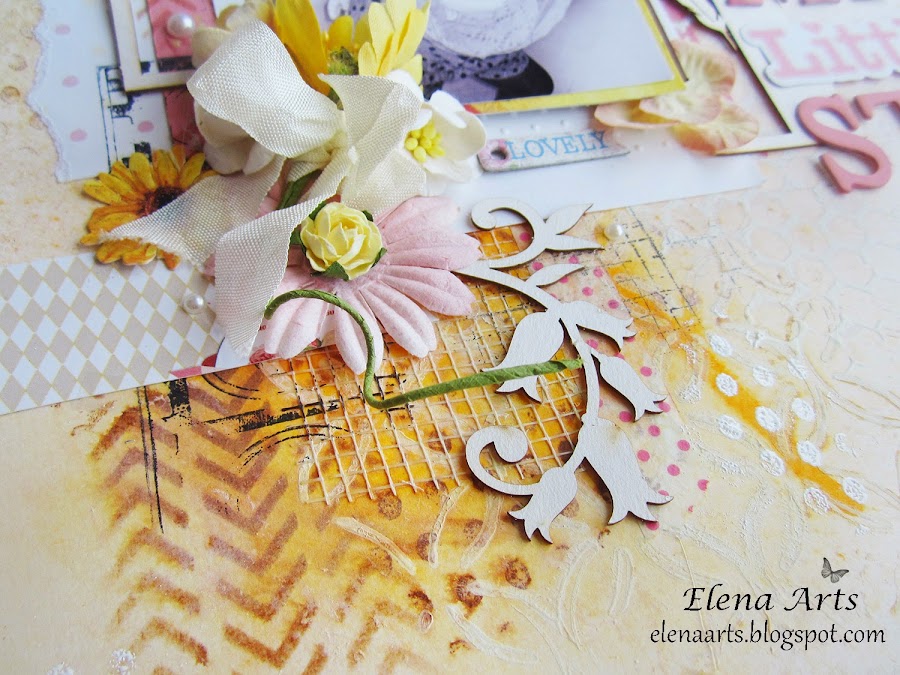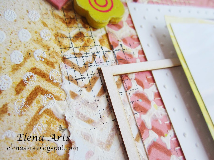 El fondo de este Lo es papel de acuarela en blanco. Después hubo muchas tintes, plantillas y gesso, chipboar, washi tape, flores y como no, una estrella dorado que es "Mi pequeña estrella".