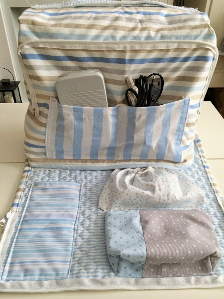 Así que como, mi cabeza que no para de dar vueltas ni dormida, se me ocurrió hacer una funda que, una vez abierta, me sirviera de "mantel" para la máquina con bolsillos para las necesidades que yo tenía.