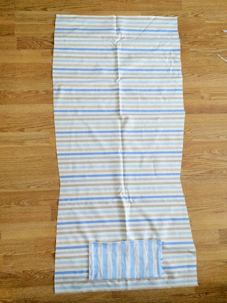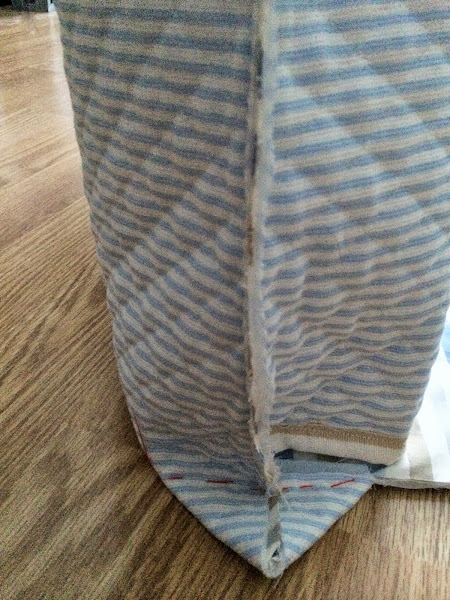 (La tela está doblada en la la línea A y se han cosido los laterales hasta la línea C. Los cuadritos azules son el revés de la funda. Las rayas, el derecho.)
