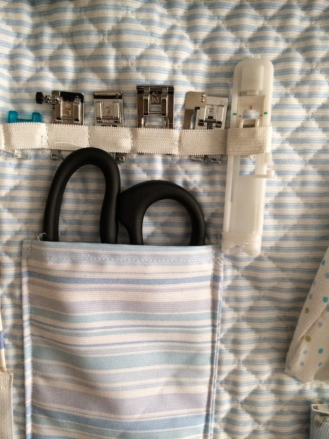 Una vez hechos me di cuenta de que una de las cosas que más pereza me da, cuando estoy cosiendo, es buscar el prensatelas correspondiente a la puntada que estoy usando. Así que se me ocurrió coser una goma para poner todos los prensatelas y el "aparatito" para hacer ojales:
