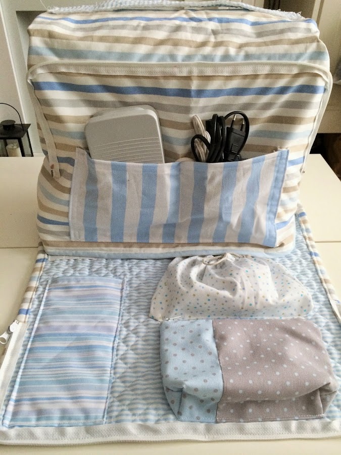 Peeeeeero para llevármela necesitaba una buena funda, ya que la que venía con la máquina era un plástico cutre, y yo necesitaba poder transportarla con seguridad. Además de esta necesidad, llevaba tiempo pensando en que, cada vez que me pongo a coser y por mucho que en la mesa me deje las tijeras, el acerico y demás siempre acabo levantándome, o tirando de la mesa las tijeras o echando los hilos a la alfombra.