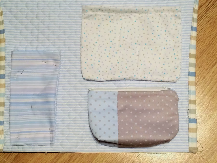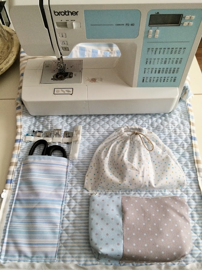 El de la izquierda tipo plastrón para las tijeras; el de lunarcitos con cordón para que me sirva de "papelera" para echar los hilos mientras coso y el de abajo es tipo neceser de viaje, con cremallera, para guardar todos los "complementos" de la máquina de coser.