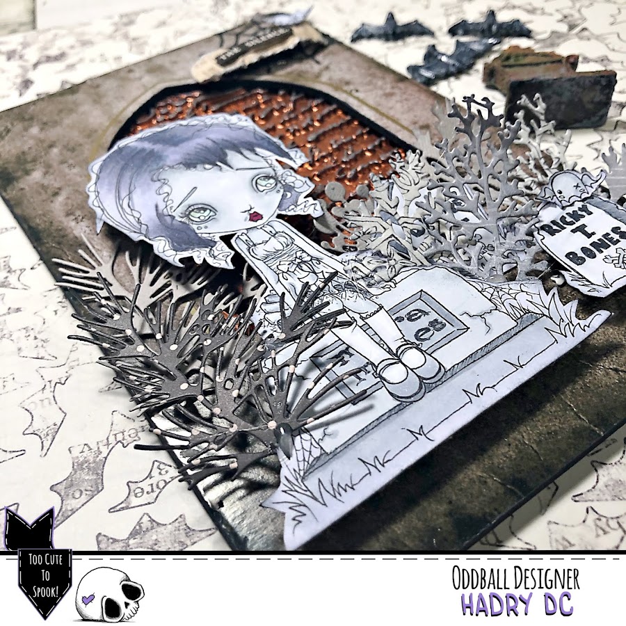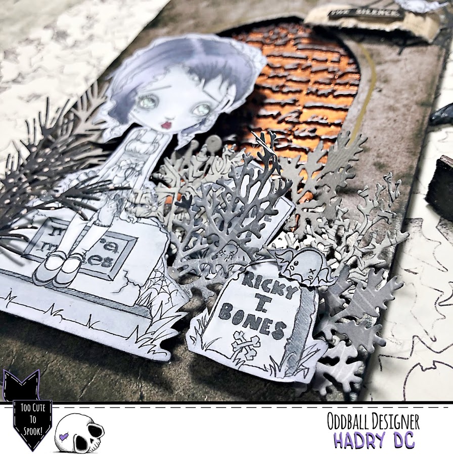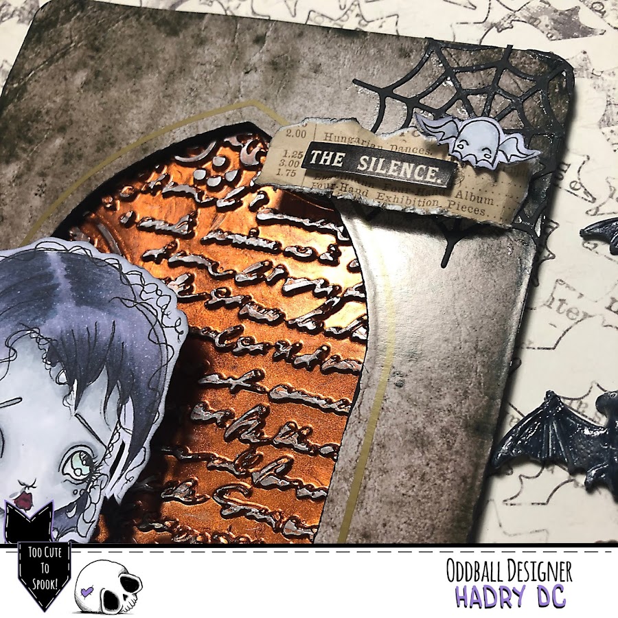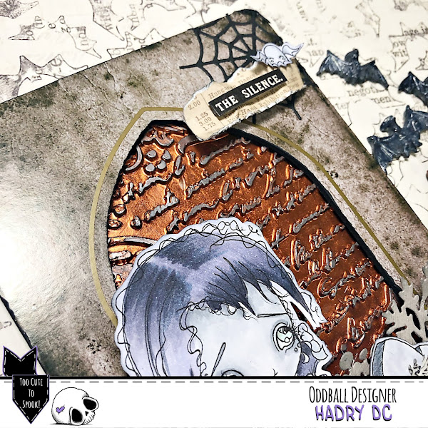 He usado un chipboard de Tim Holtz de Halloween como si fuera una cripta, por detrás he puesto Icing paste de Finnabair "Red Amber" que la he dejado secar sobre un molde de Stamperia y para resaltarla le he dado con Wax "Brushed Iron".
